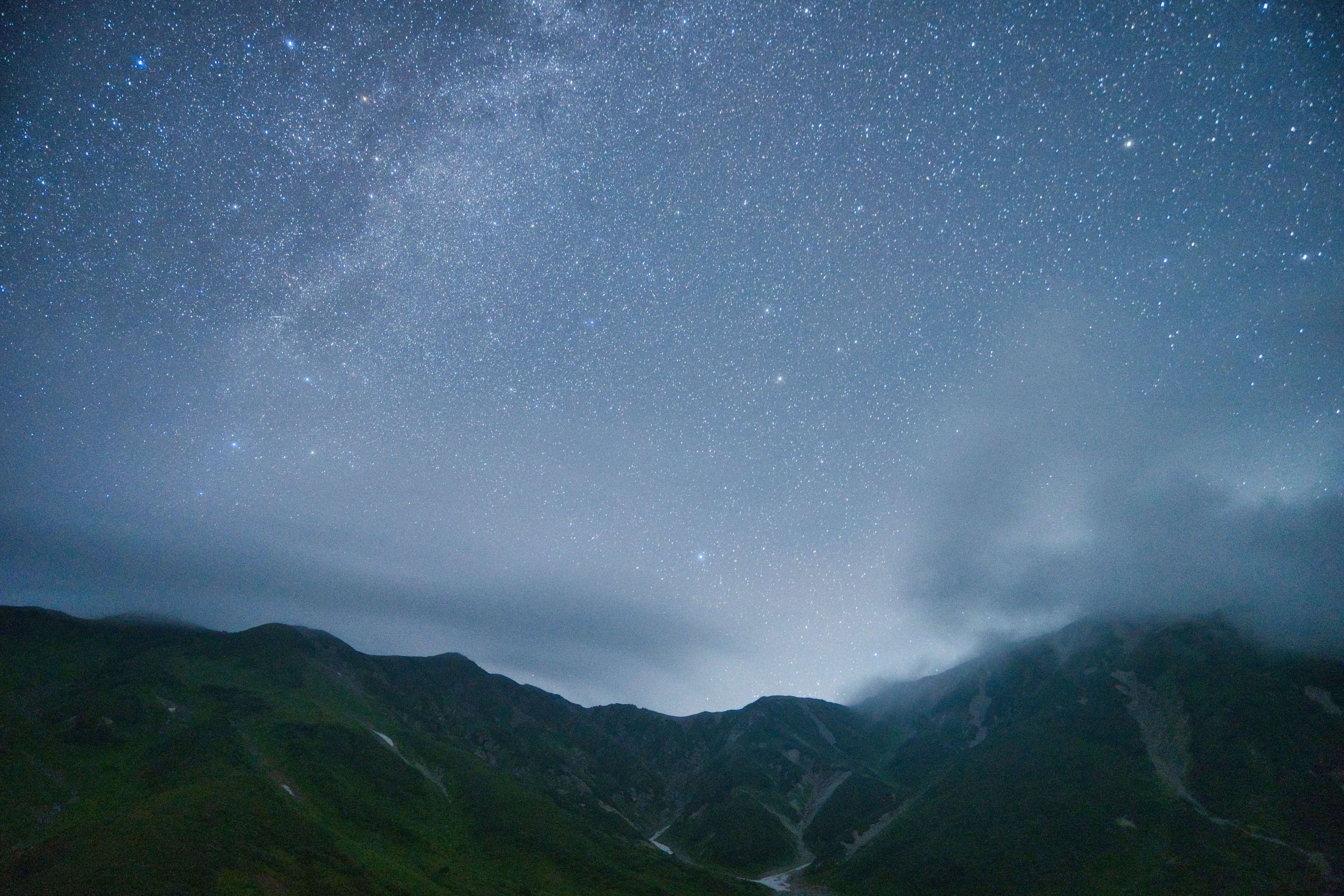 北アルプスに入山して2日目の夜、ようやく前線が移動し、待ちに待った夏山の夜空を拝めました。