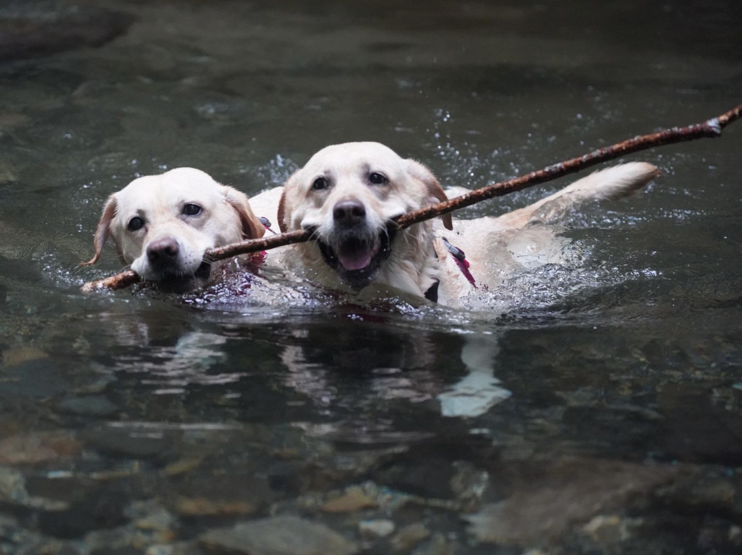 秘境での川遊び 大きな枝を自慢げにくわえてくる二姫達 猛暑の中 つかの間幸せ時間でした