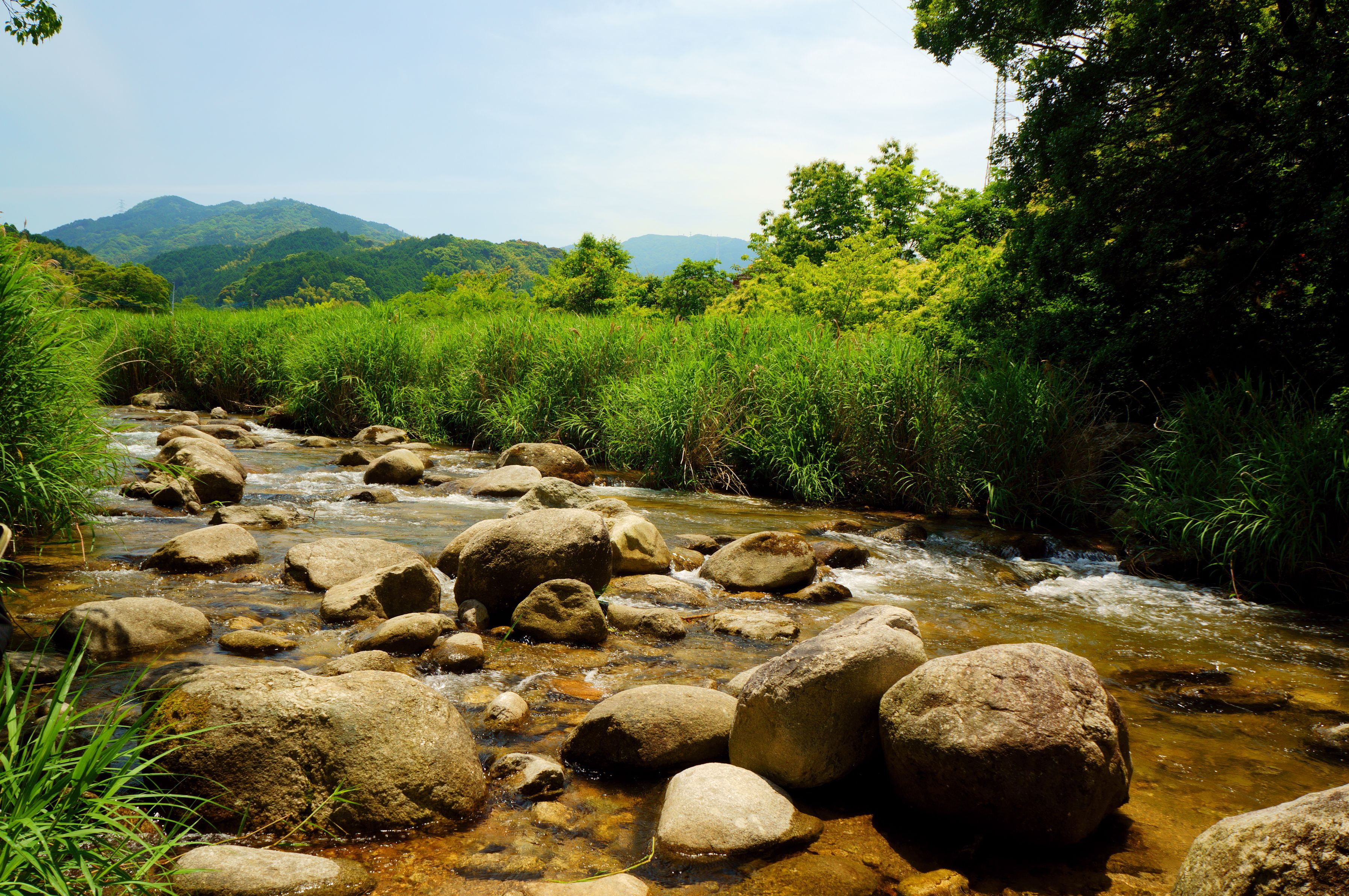福岡県那珂川市の中州から、那珂川と山を撮影しました。 数十年前の子供の頃から、変わらない夏の風景です。