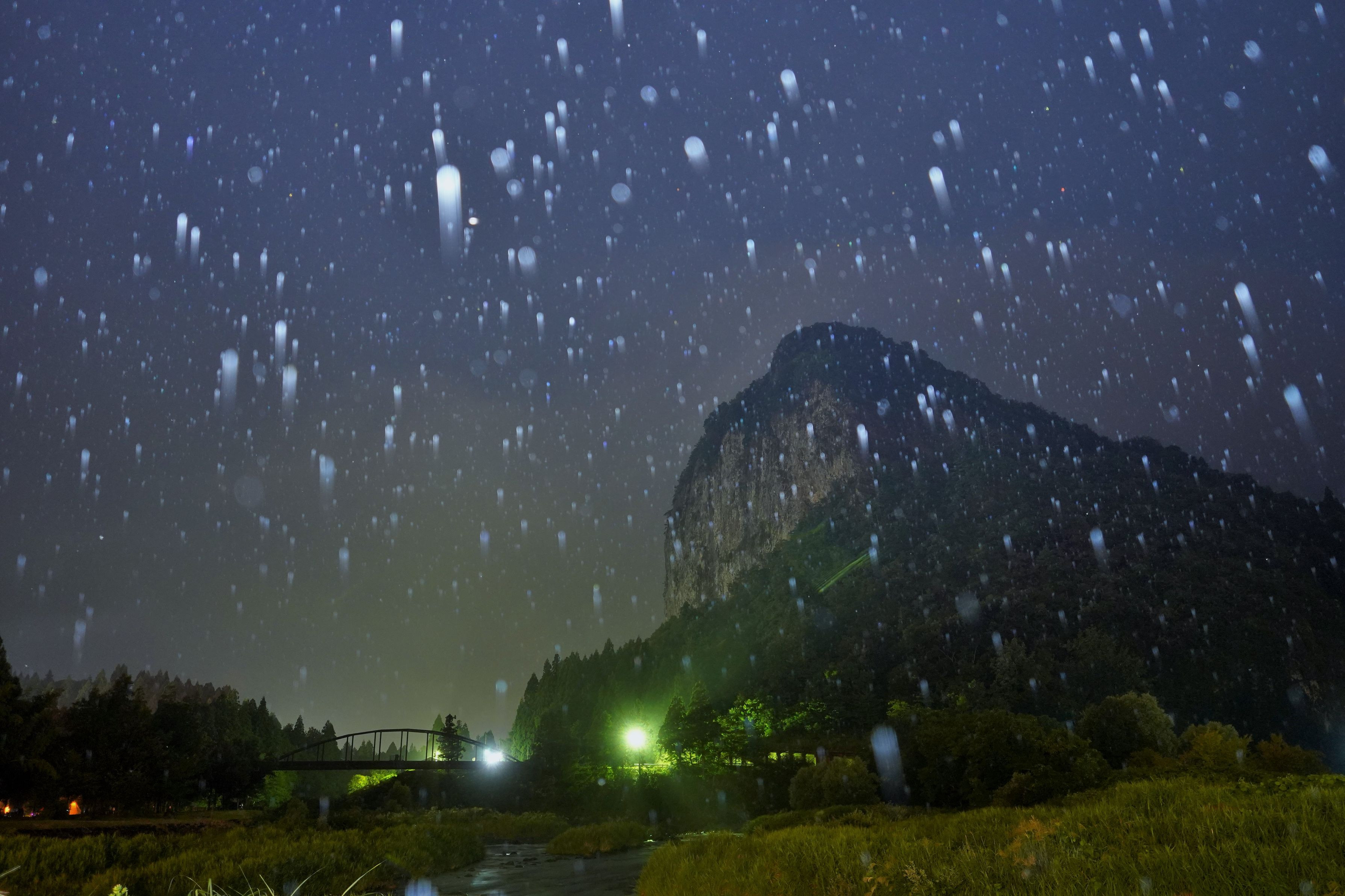 新潟の三条市にある岩山「八木ヶ鼻」です。雨の夜に出かけて、フラッシュを焚いて雨粒を加えました。
