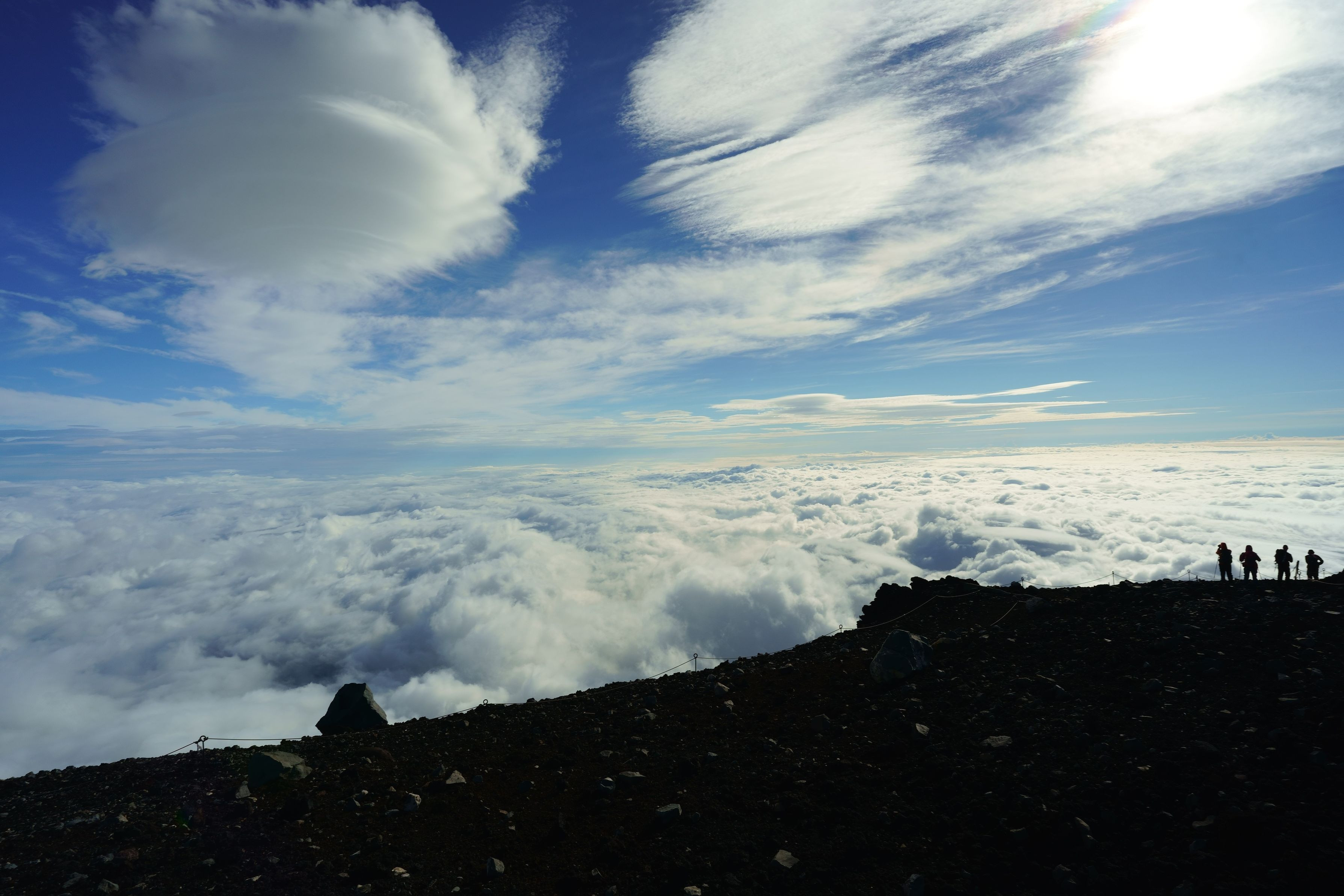富士山の雲海 登る途中に雨が降って写真は撮れないだろうと期待してなかったが、山頂に着き、雲が晴れていくと足元に綺麗な雲海が観え、テンションが上がりシャッター押しまくりでした(笑)