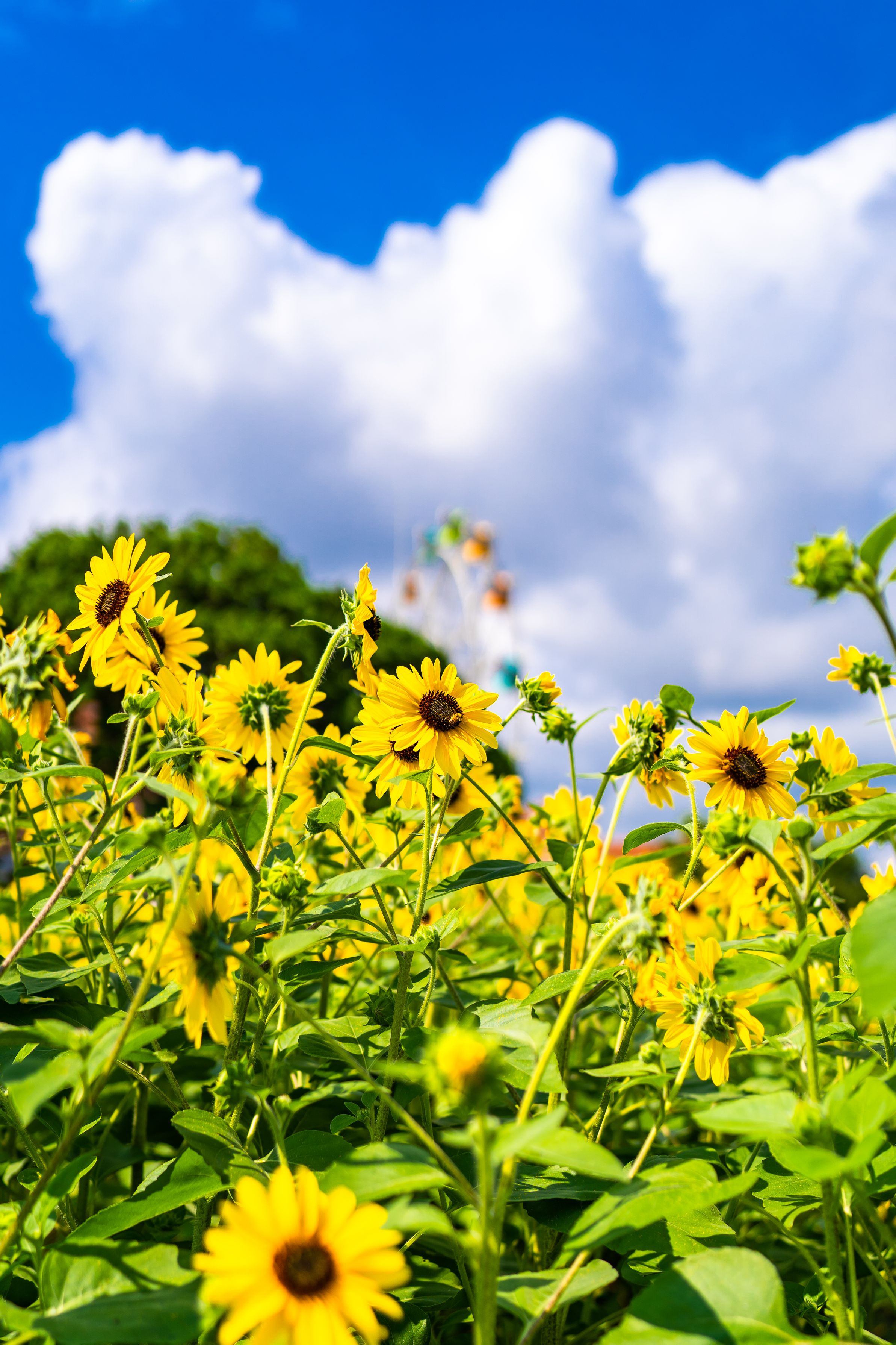 夏休み直後に公園で向日葵を撮りました。観覧車も出番を待っています。