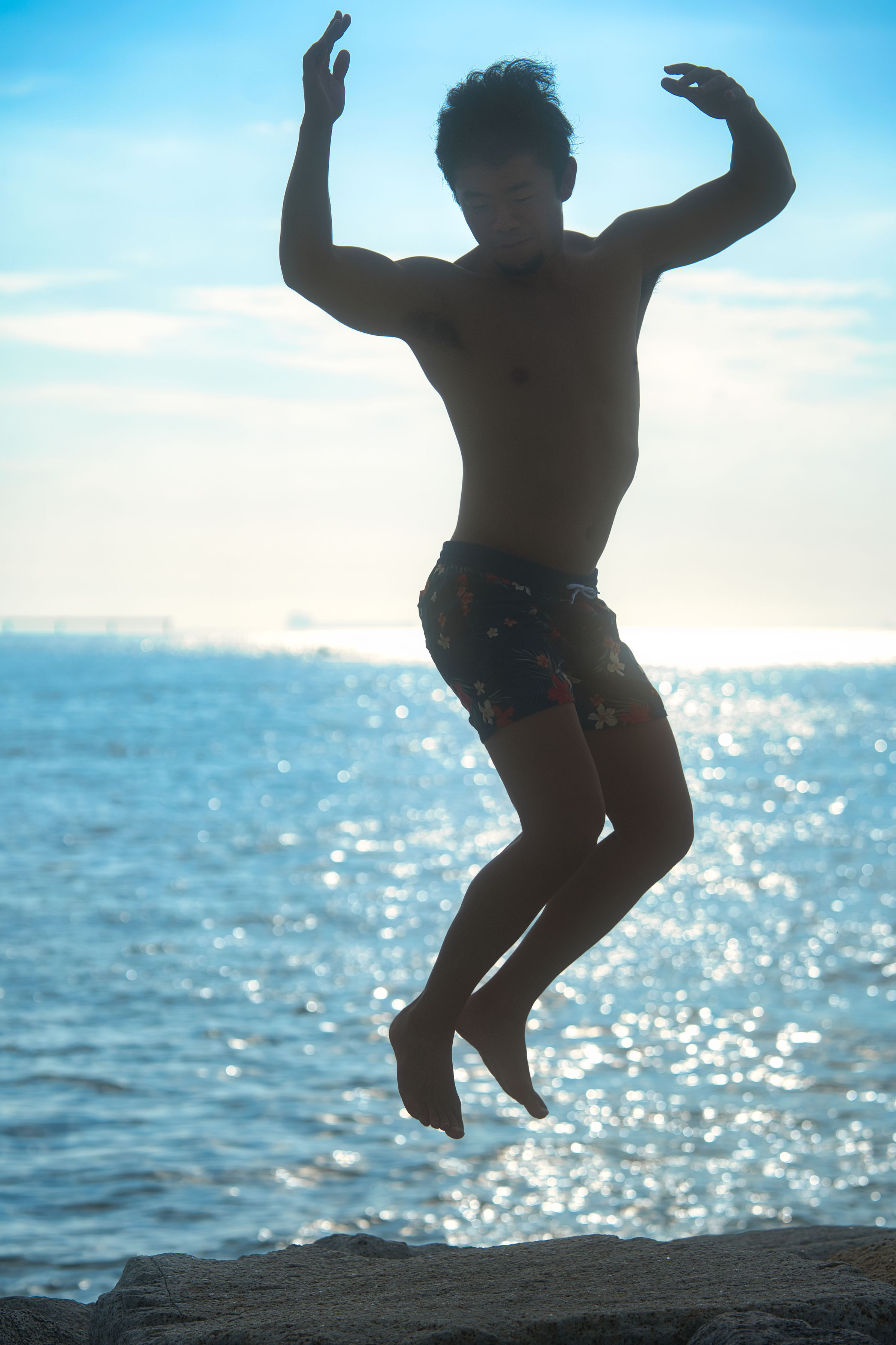 場所は常滑ビーチ、ボディビルダーの友人が海辺で現す躍動感を撮りました。