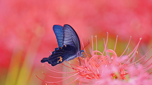 朝晩涼しくなり、ヒガンバナが咲き誇り、そこに夏に別れを惜しむ、クロアゲハが