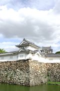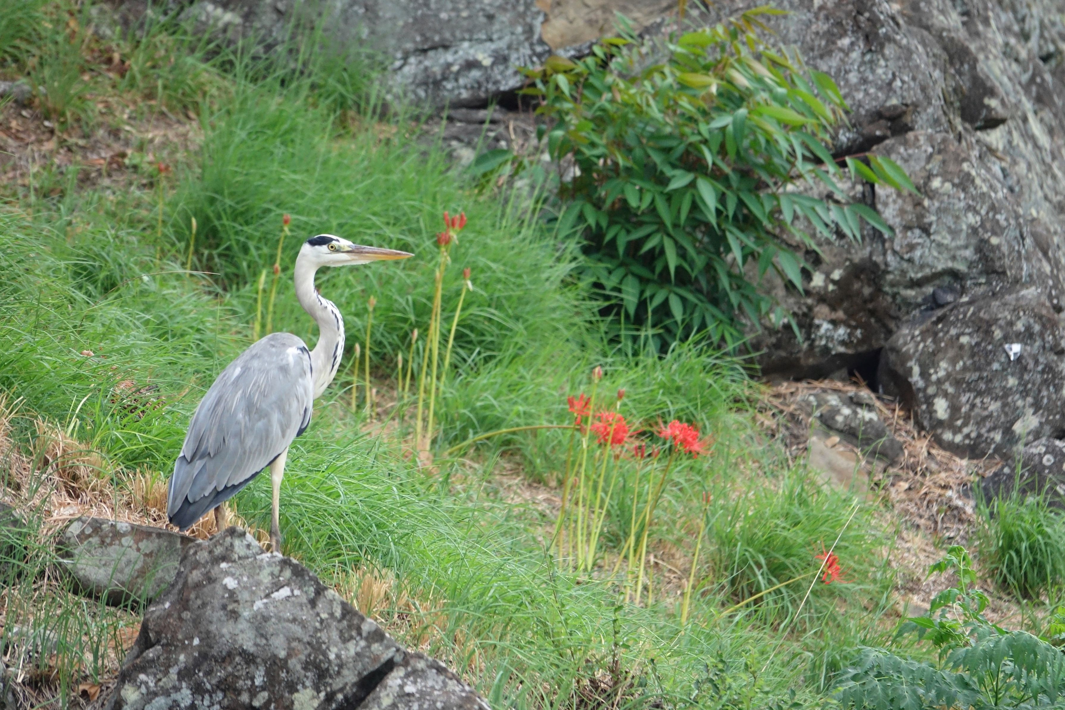 お城の石垣にヒガンバナと鷺が目にとまりました。