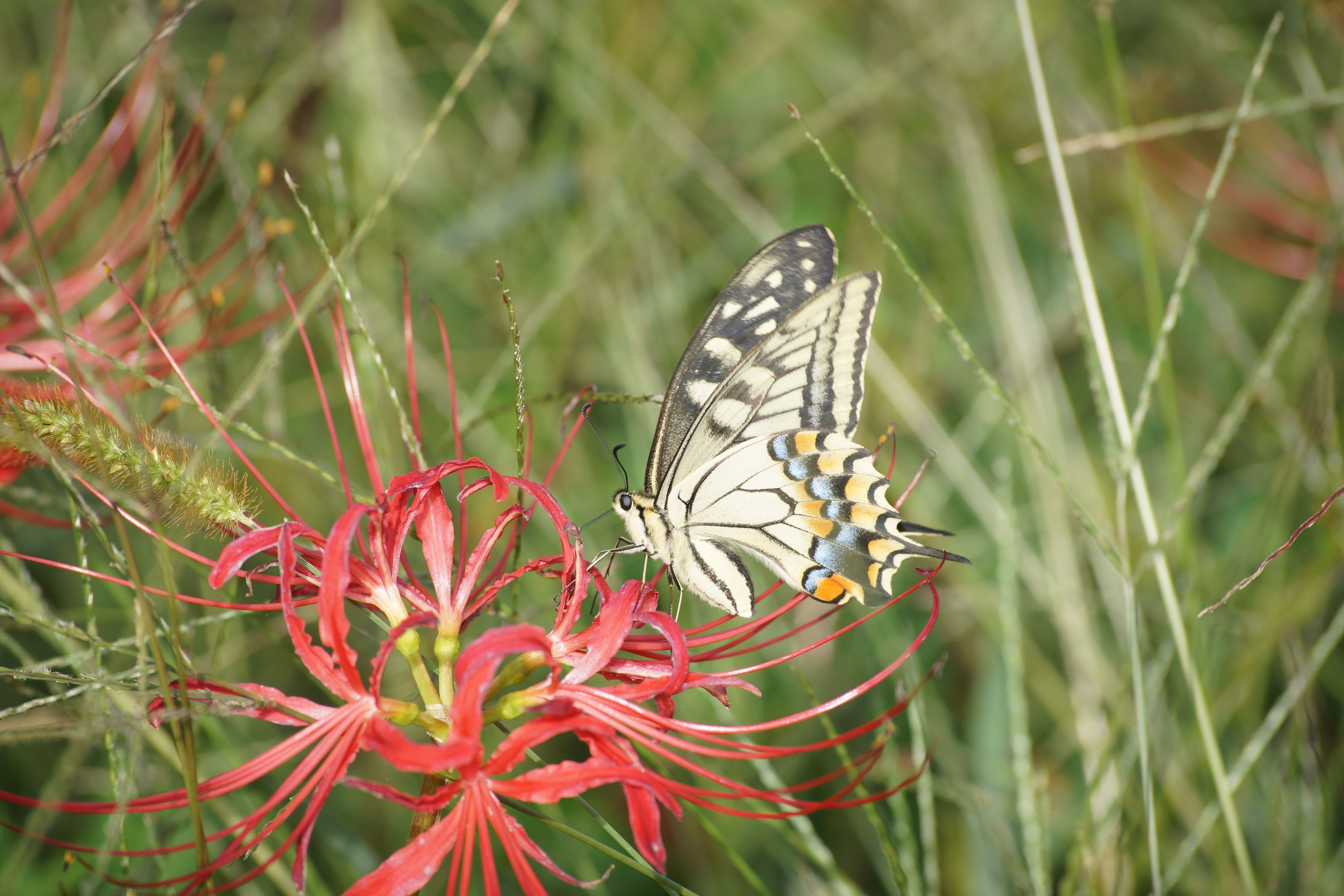 秋の花ヒガンバナが満開にキアゲハが、吸蜜に訪れていた。
