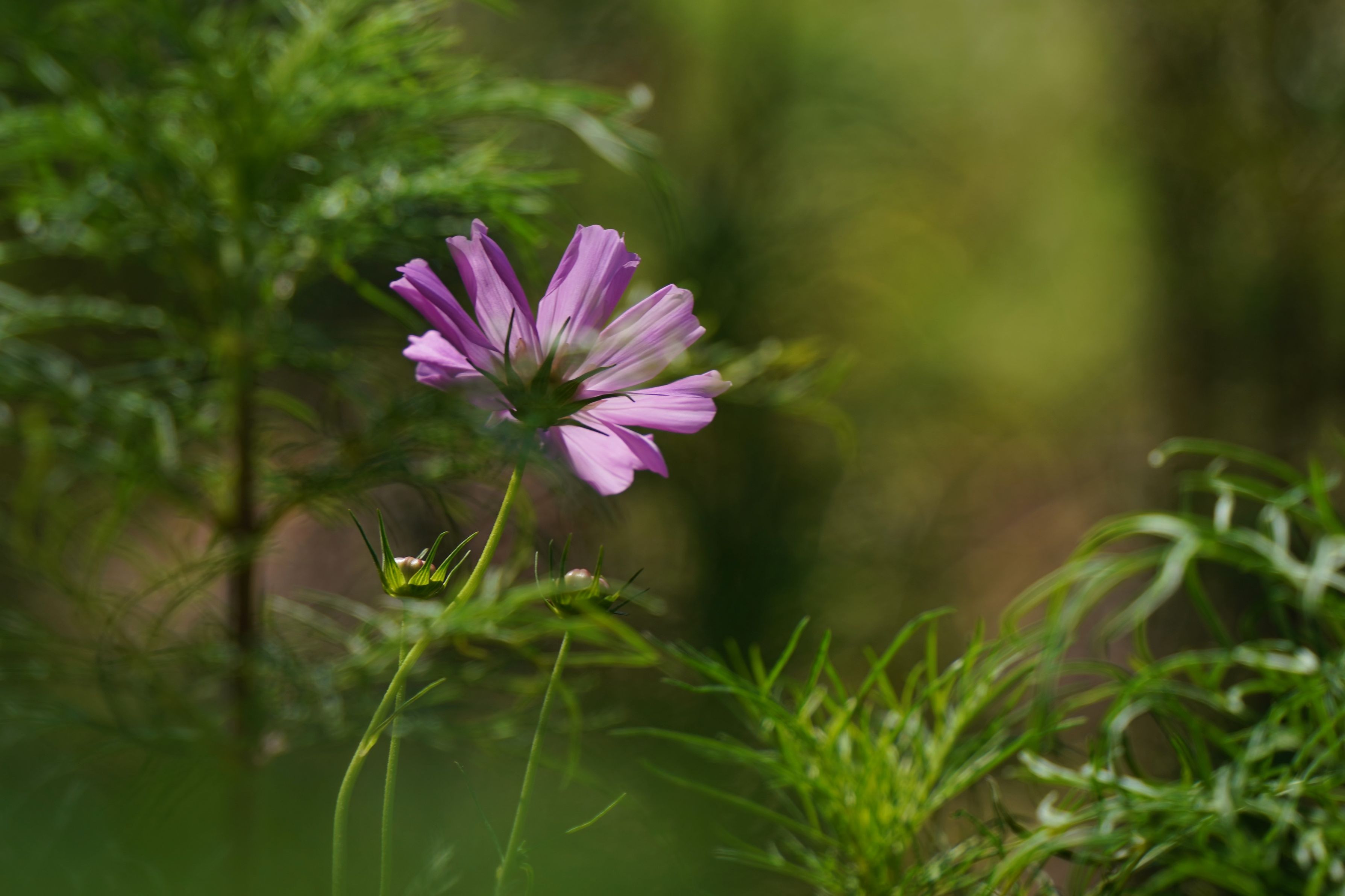 公園でやっと咲き始めたコスモスに 綺麗な日差しが差しこんでいます
