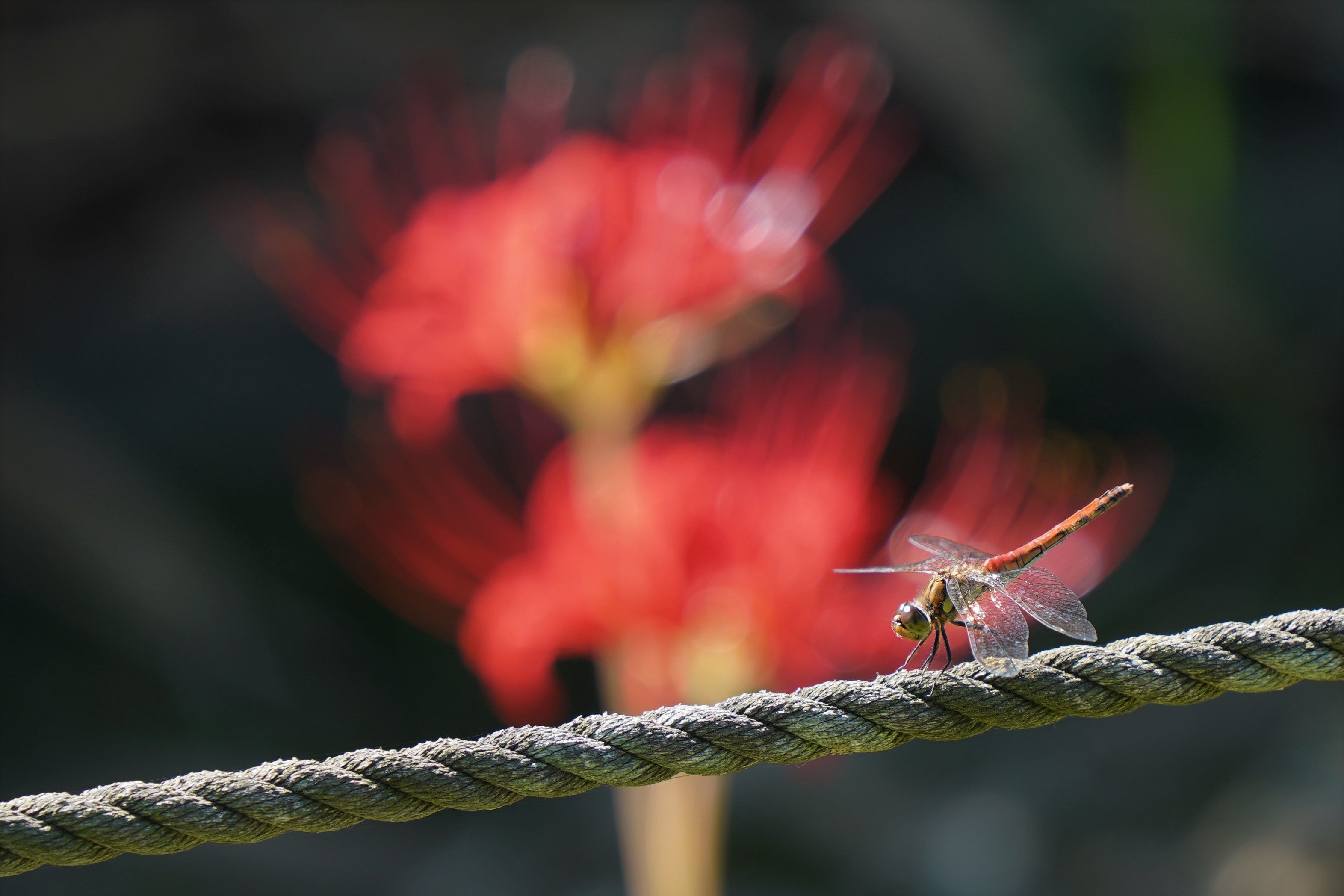 公園内に咲き揃うヒガンバナの傍で 柵のロープに一匹のトンボがとまっていました まるで綱引きみたい・・・と思わず独り言