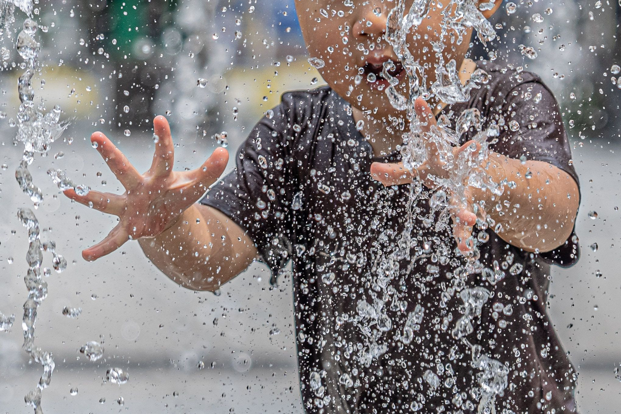 ある夏の暑い日、池袋駅前の噴水で水に立ち向かう一人の男の子を見ました。初めはおっかなびっくりでしたが、水の変幻自在な形と心地良いひんやり感に取り憑かれたように、途中から遊び始めました。少年時代、好奇心に駆られて色々なことを新鮮に見ていた自分を思い出し、少しホッコリしました。同時に、付き添いのお父さんの大らかさと優しい眼差しに感心したものです。そんな一瞬の空気感が伝わる作品になったと思います。