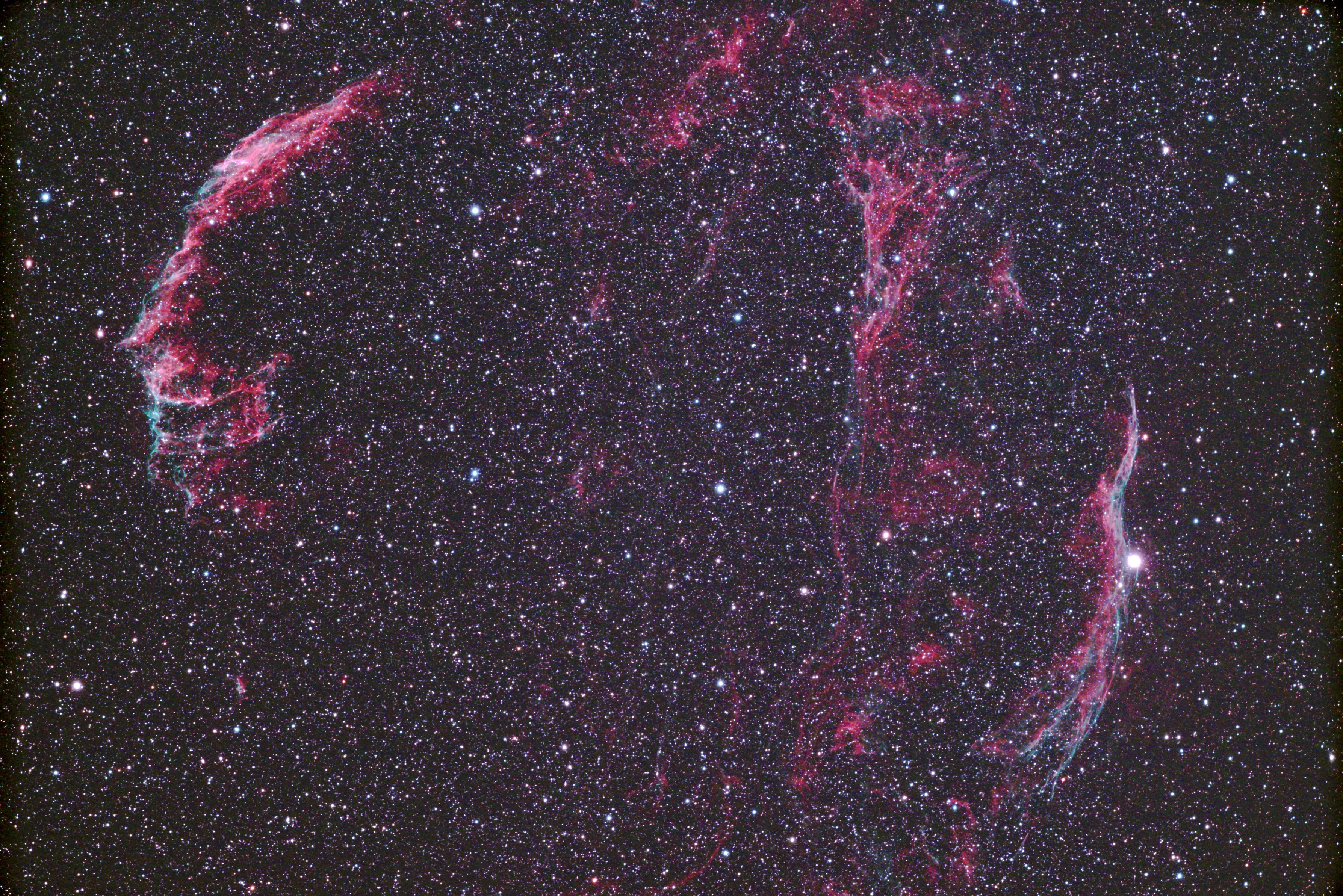 はくちょう座の網状星雲,数万年前の超新星爆発の残骸ガスが毎秒100kmで広がっている姿。 FS-60CB+エクステンダー 600mm f10,ISO2500,5分×24,CBPフィルター,ダーク・フラット補正,StellaImage9で加算平均 1枚目 α7R(HKIR改造機) 2枚目 α7Ⅲ(無改造機)