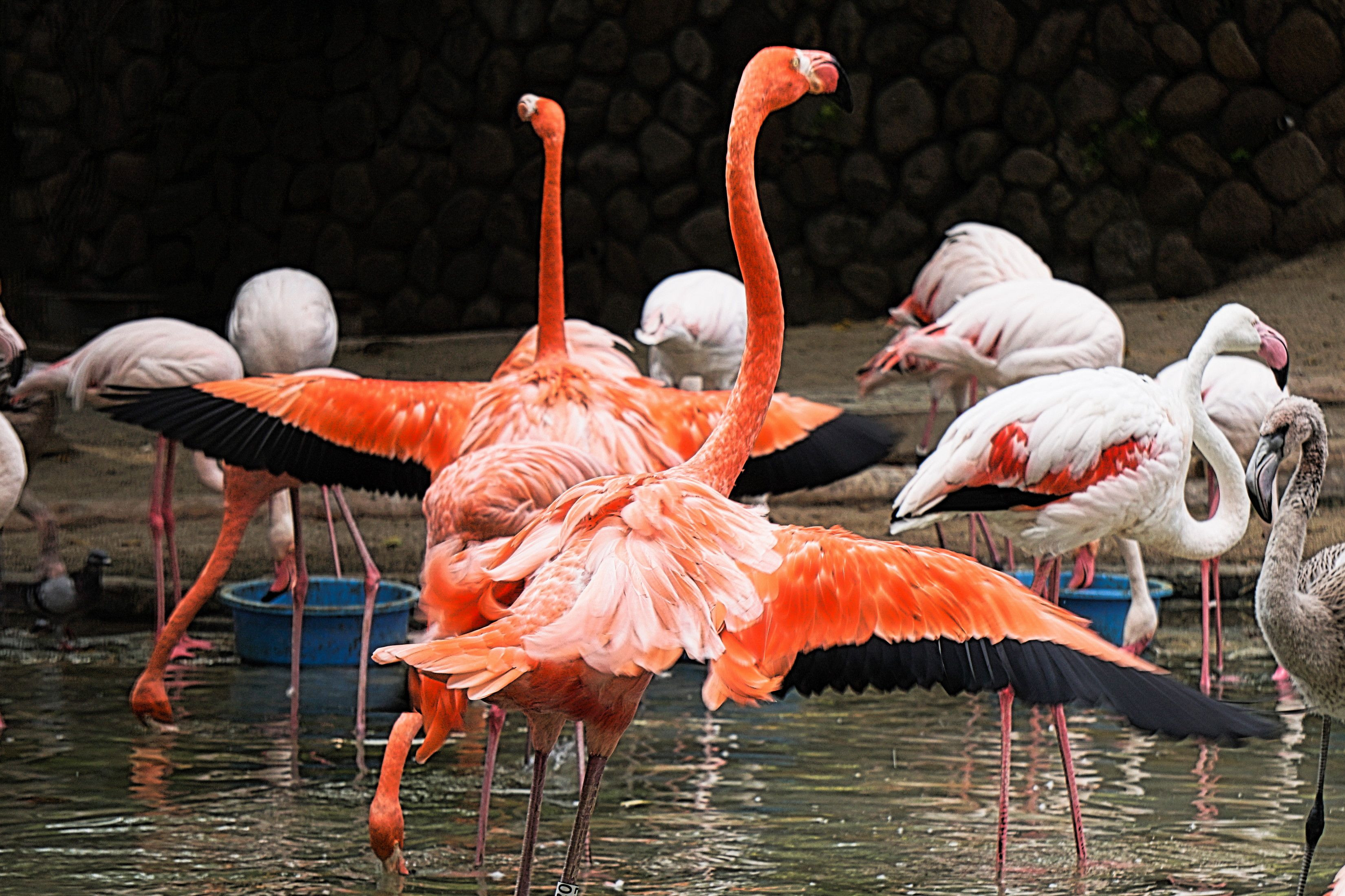 白い羽のフラミンゴの中に2羽のフラミンゴが羽を広げている構図を撮りました
