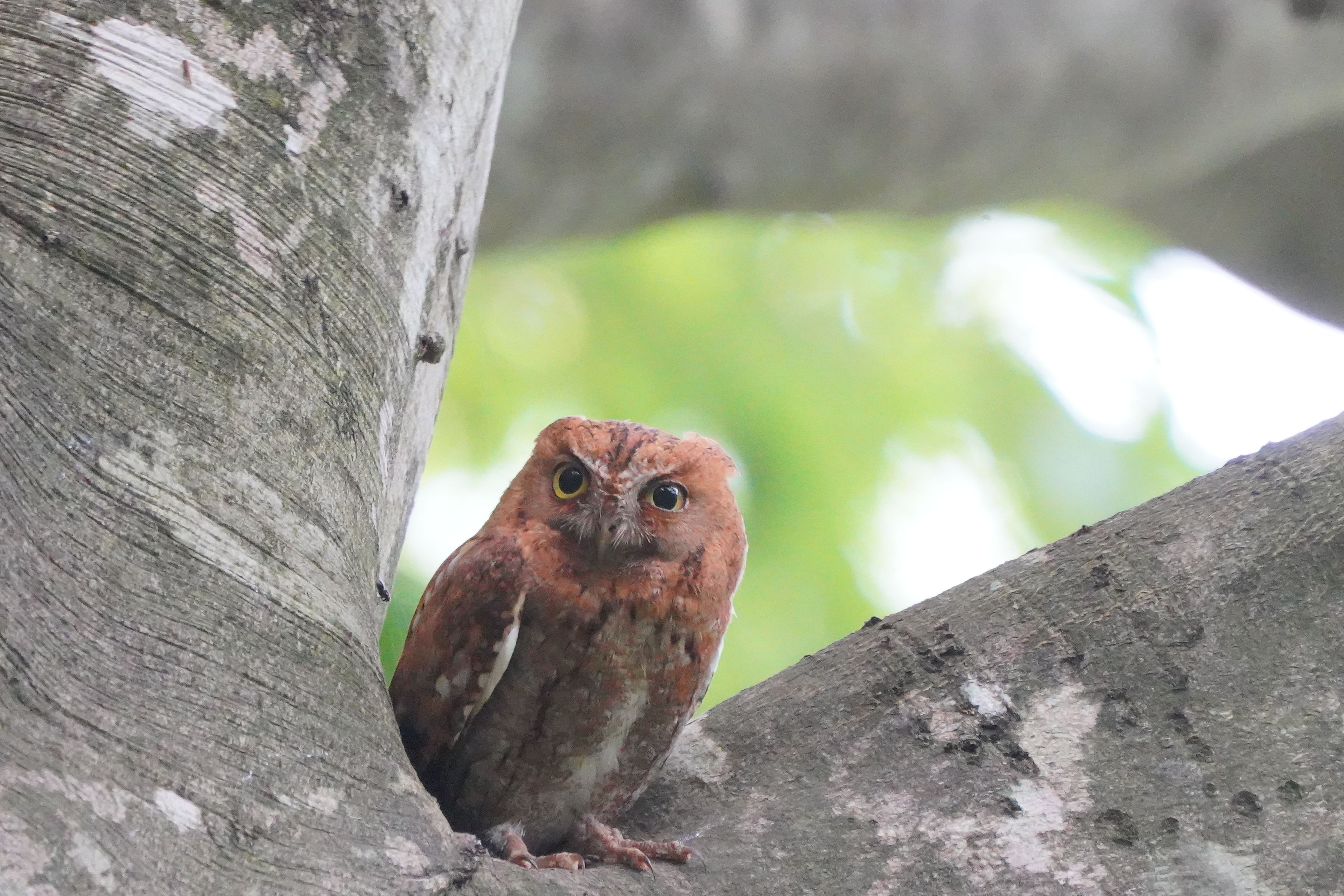 近くの巣箱の子を見守るコノハズクの母親(赤褐色型)
