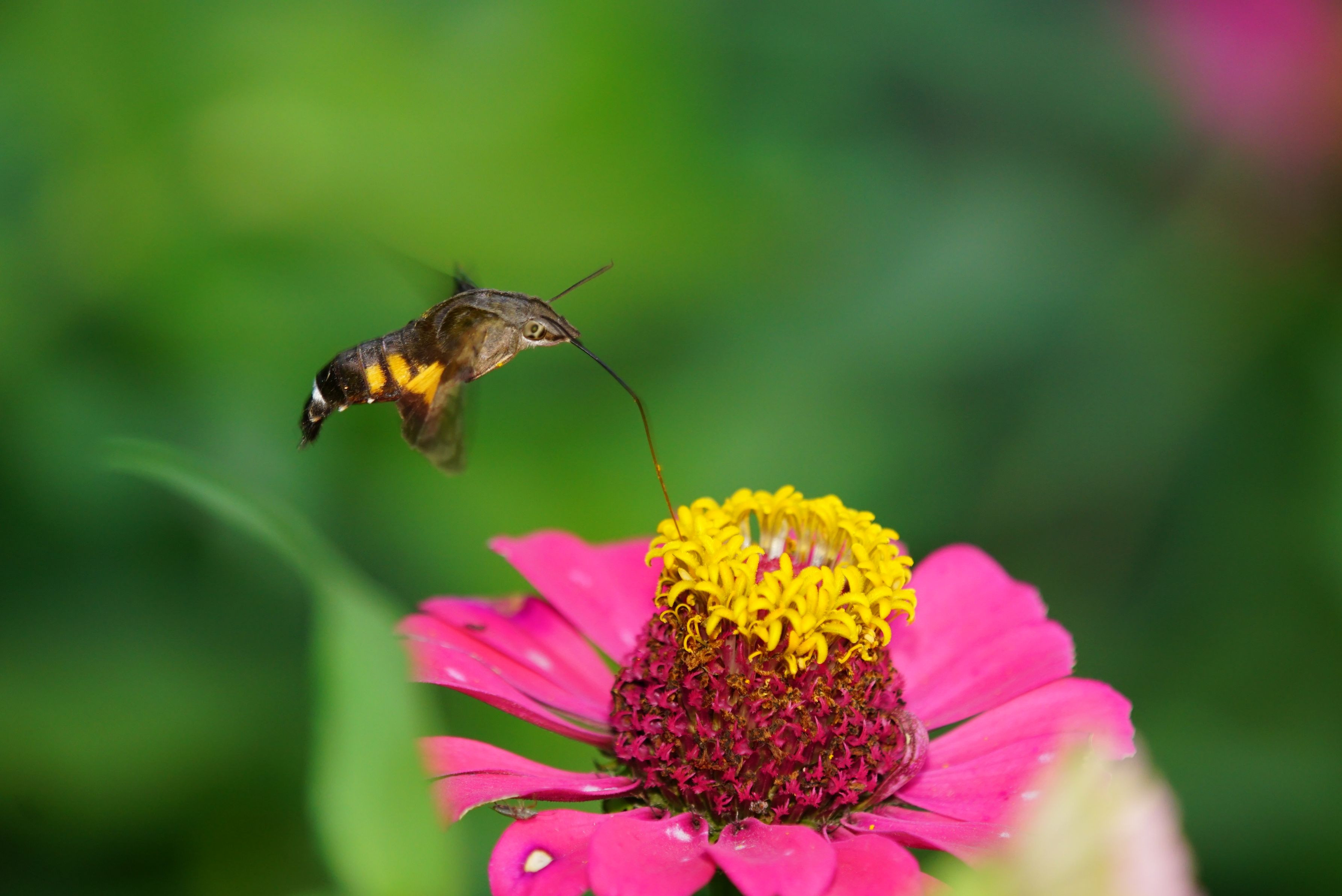 よそ様の百日草にやってきたホシホウジャク。 使用レンズはタムロンSPAF180mmF3.5Diマクロです。マニュアル露出、MF+Full+シグマEF610DGSUPER(ディフューザー装着、ストロボ光量1/16)で撮影。 どちらも同じ個体です。