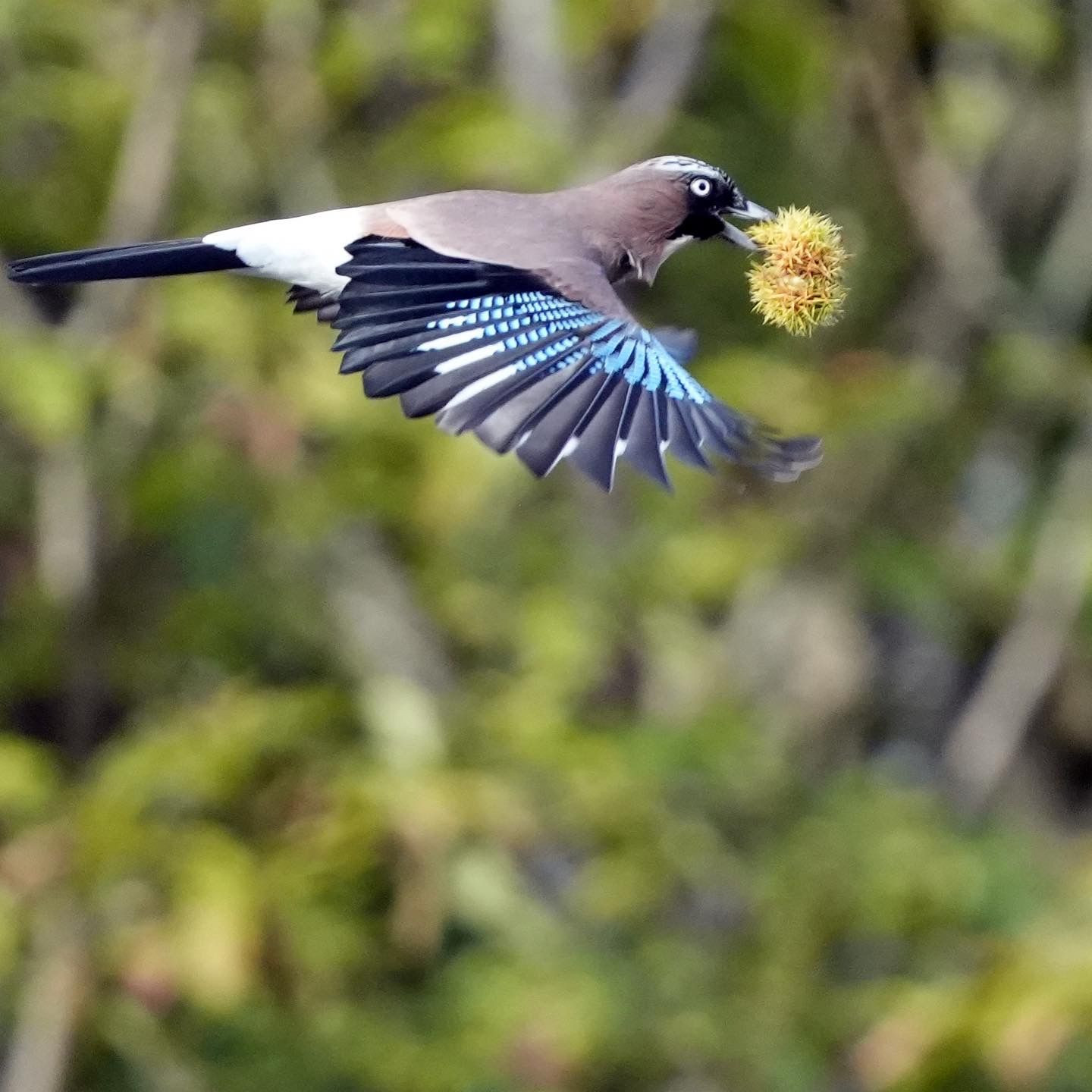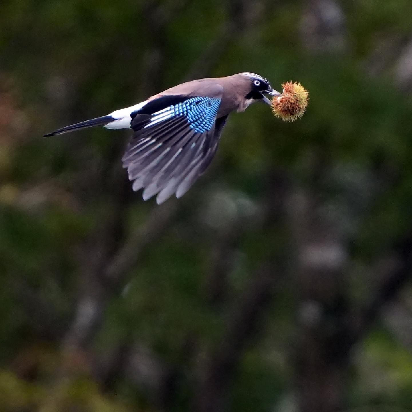能勢の山で、毬栗を運ぶカケスです。毎年この時期に見られる風景です。