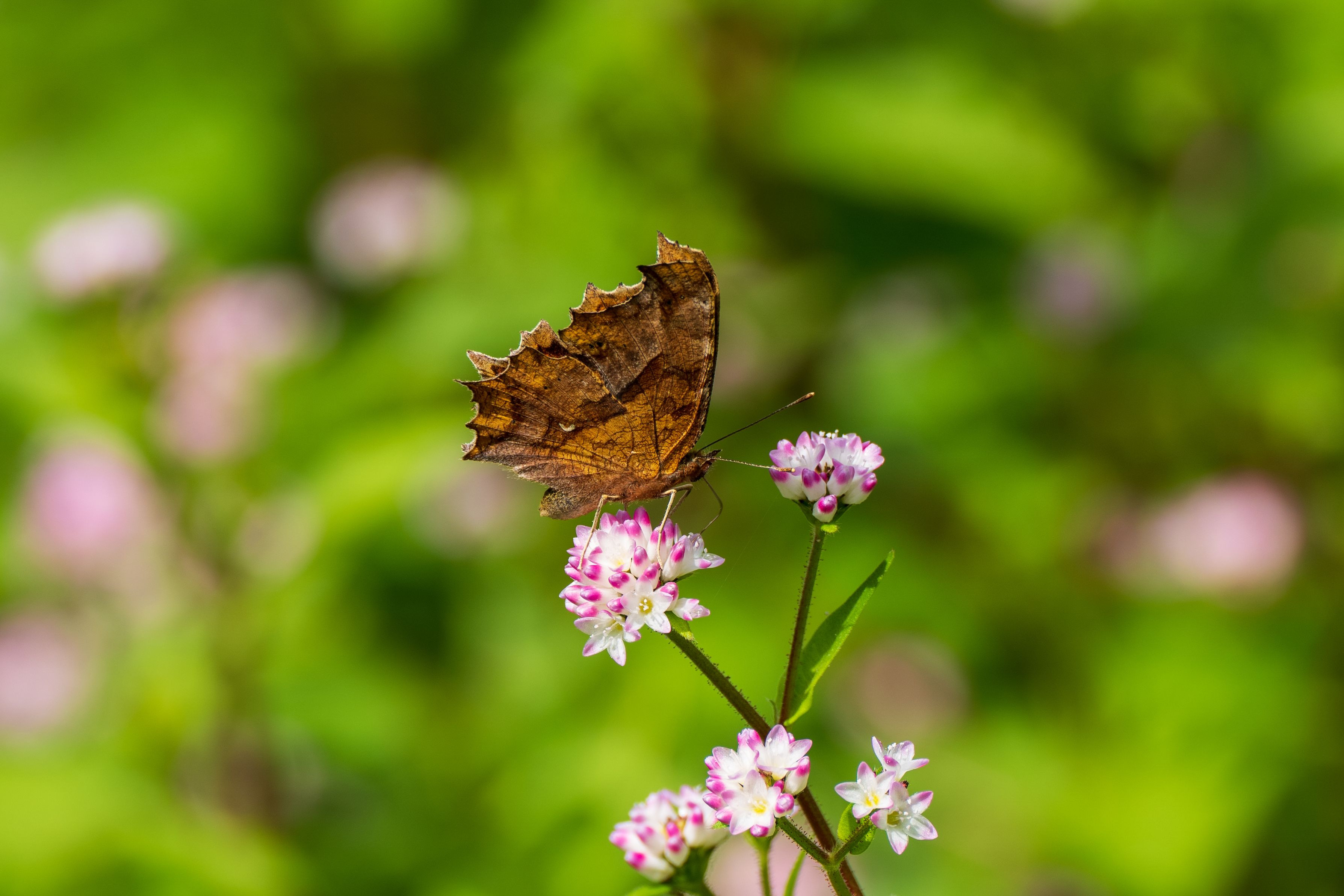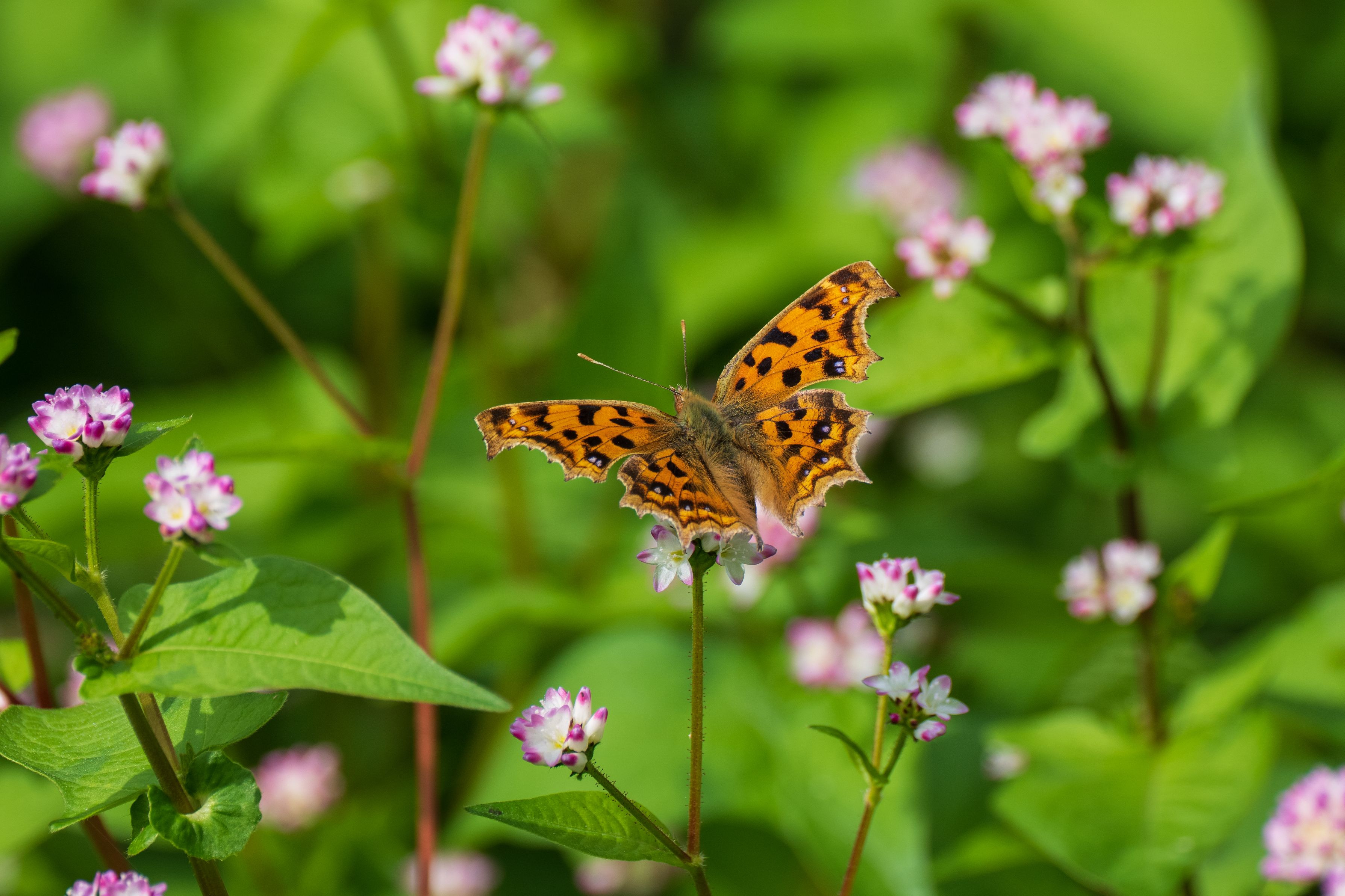 ミソソバの花畑で吸蜜するキタテハの雌さんです。