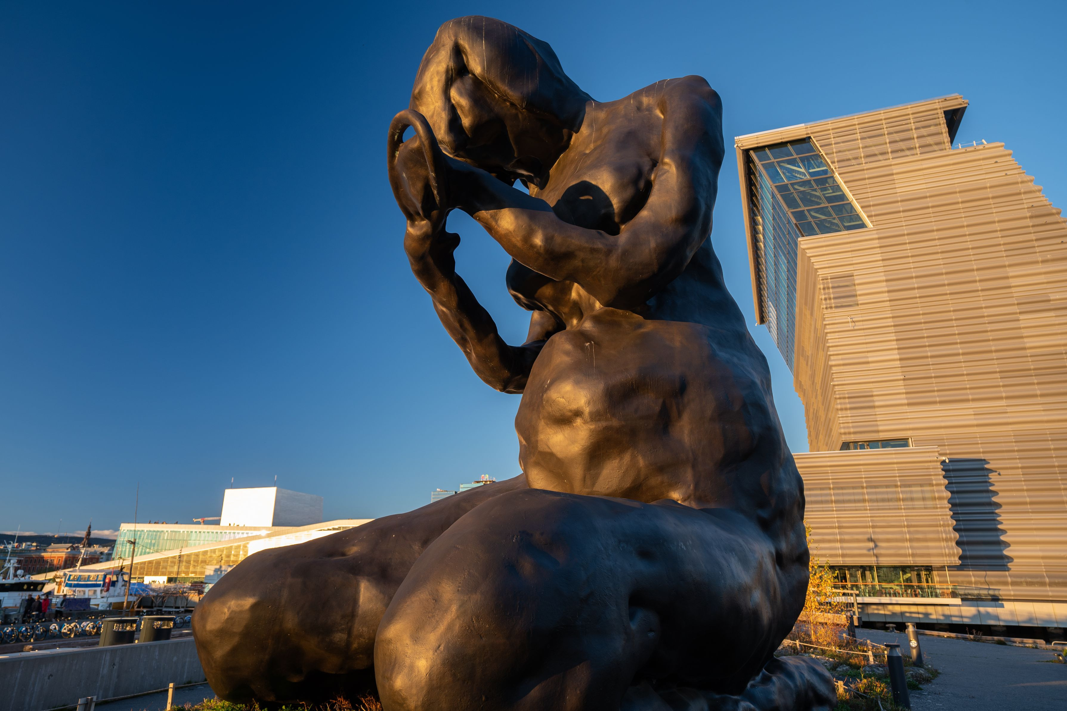 昨年10月にオープンしたムンク美術館(右)とその前に今年6月に置かれた母親像 左はオペラハウス 新たな定番スポットとなるか Adobe Lightroomでコントラストを調整しています