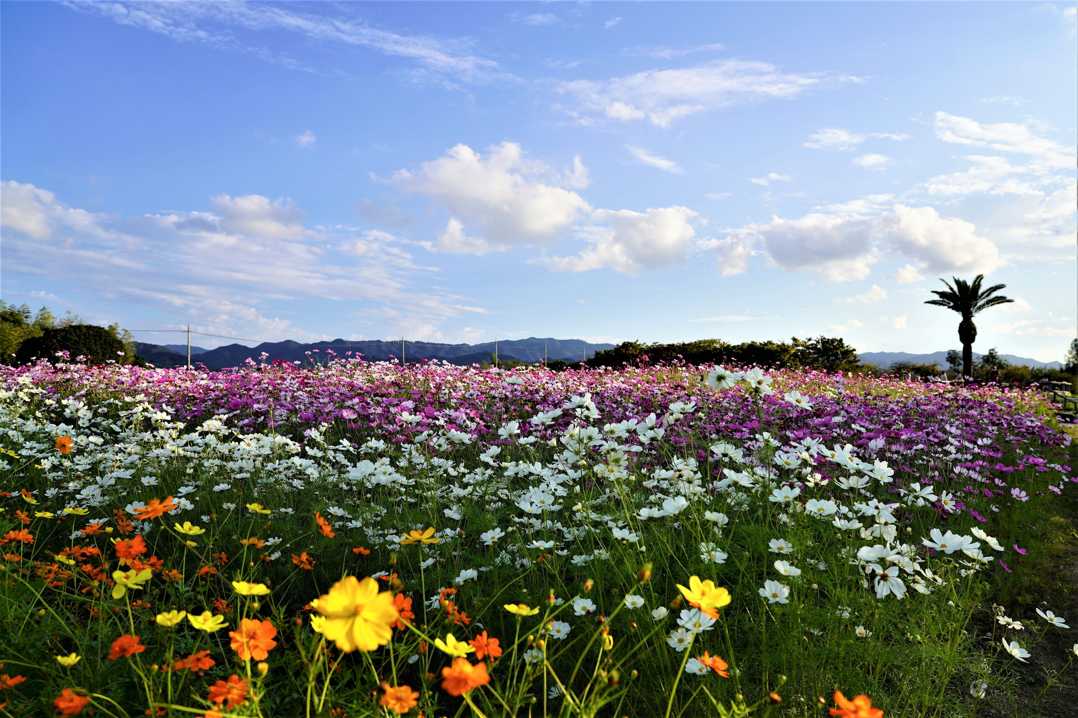 色とりどりのコスモスが青空に映えてました。