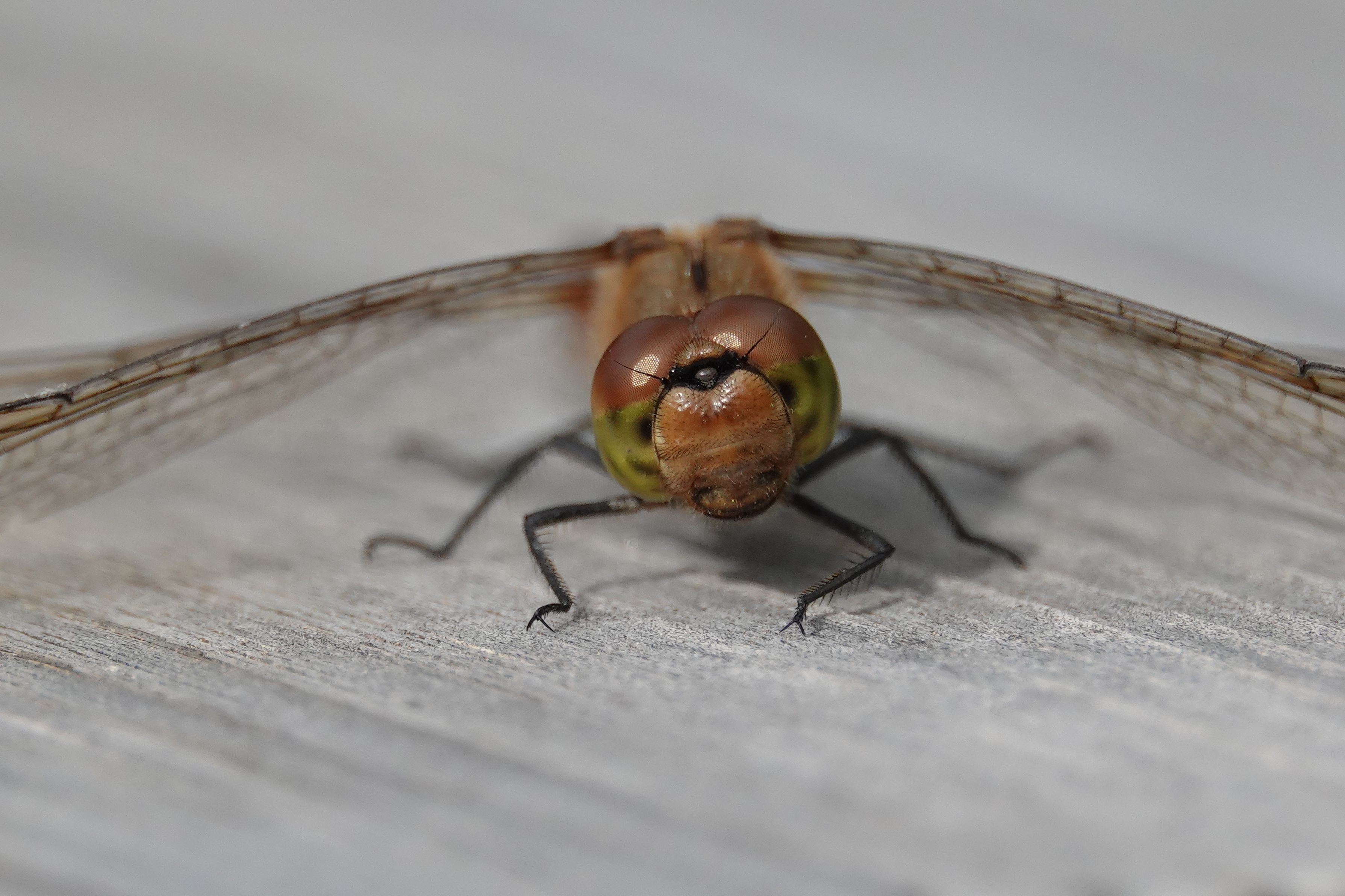 昼時、長椅子の空きが多い。 右端にアカトンボ、複眼をクルクル回す。