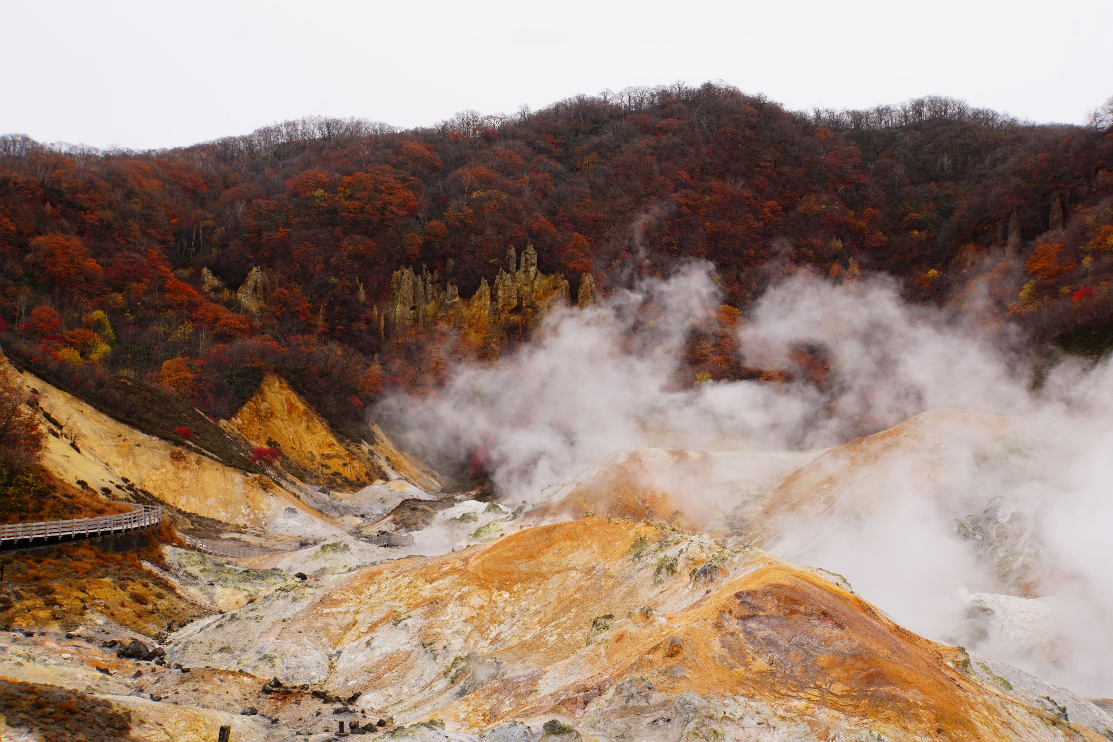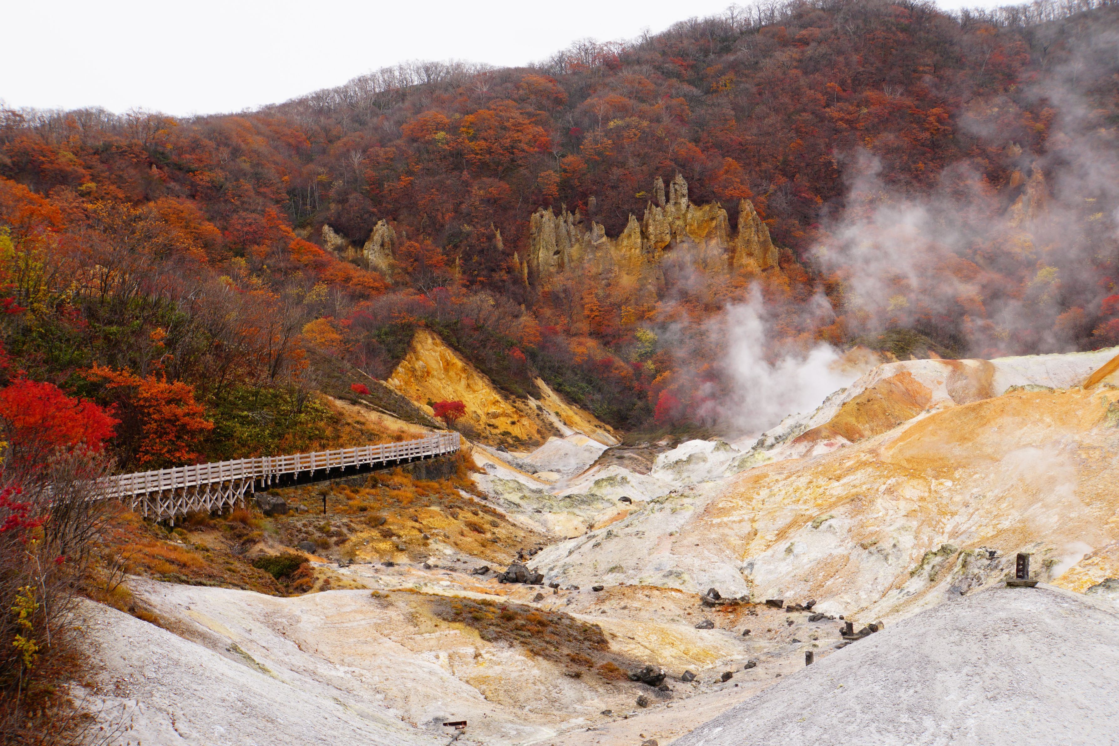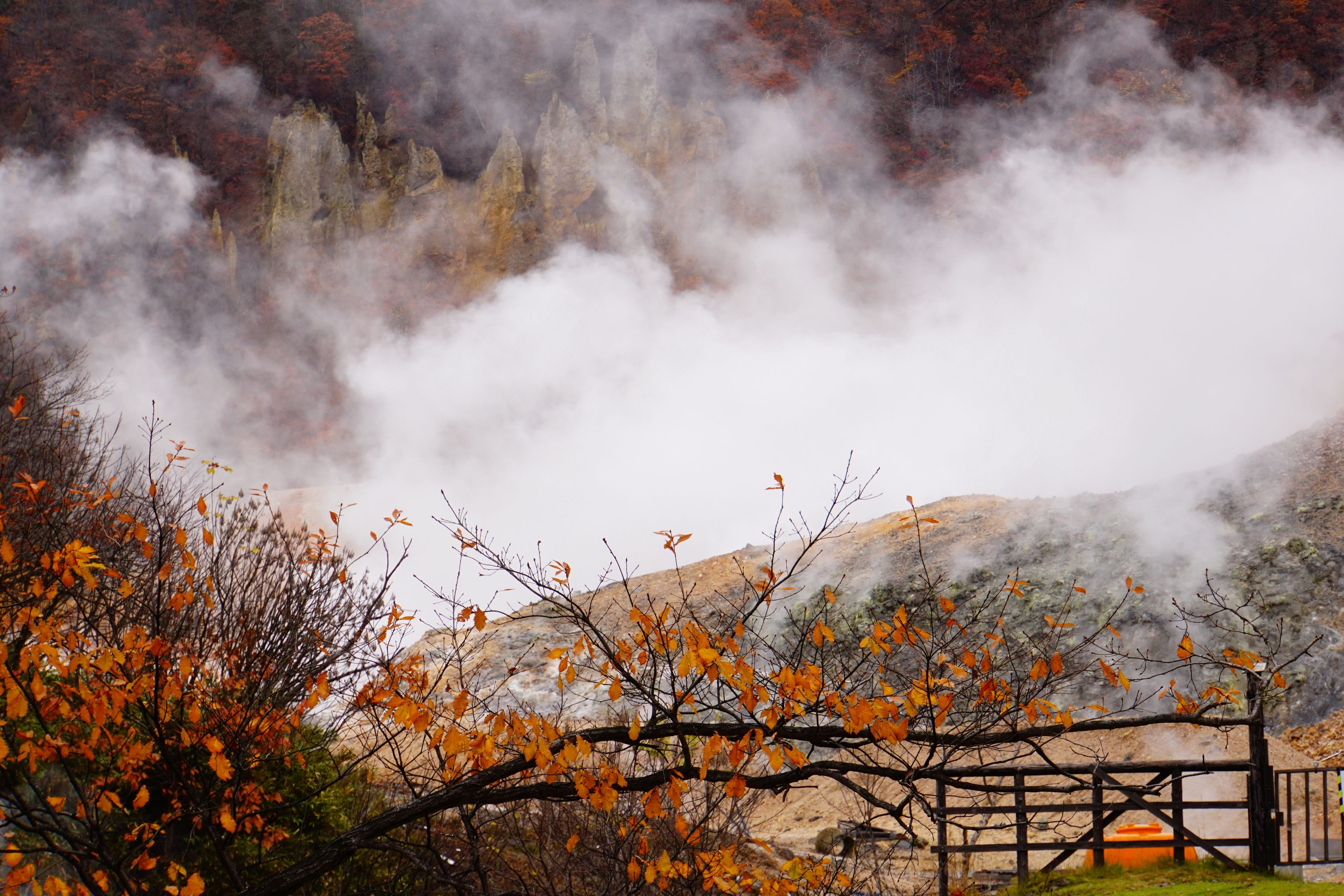 赤く色づいた紅葉と、岩肌の裂け目から立ち上る白い煙のコントラストが魅力的でした。
