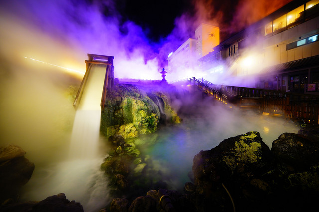 雨が降り続いていて、傘をさしながらの撮影になりました。湯畑の周りは浴衣を着た宿泊客で賑わっていました。