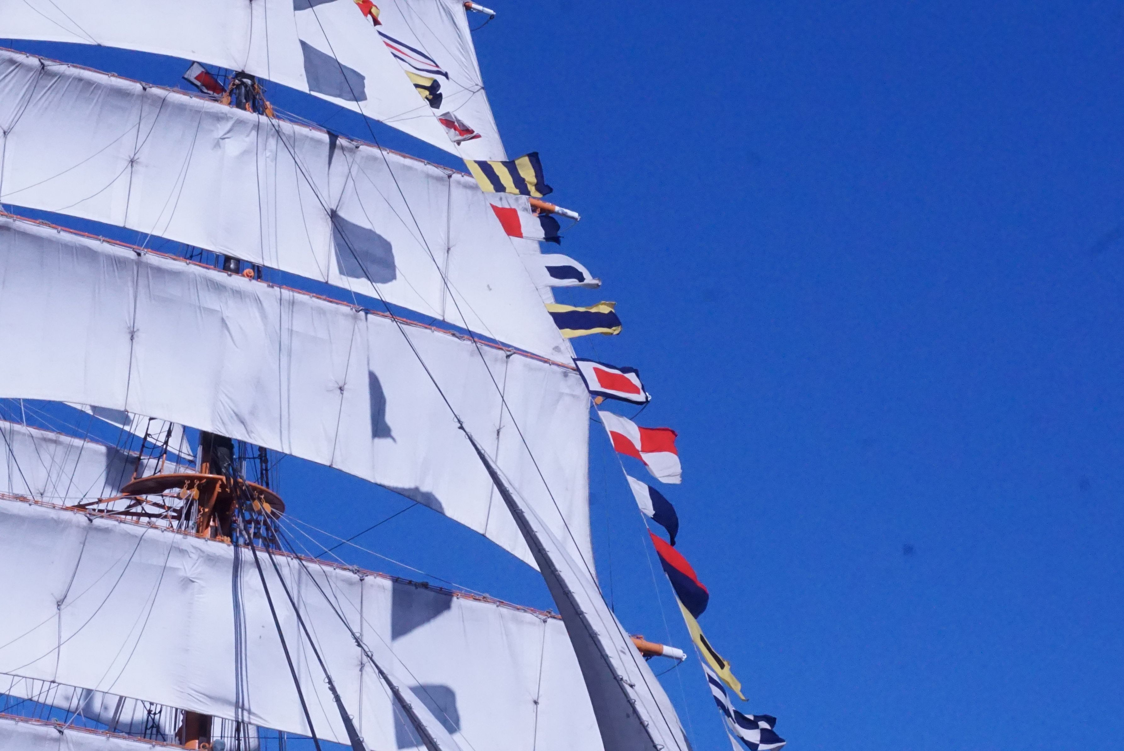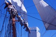 帆に映える国旗と帆をたたむボランティアの皆さん。 曲芸師のよう。