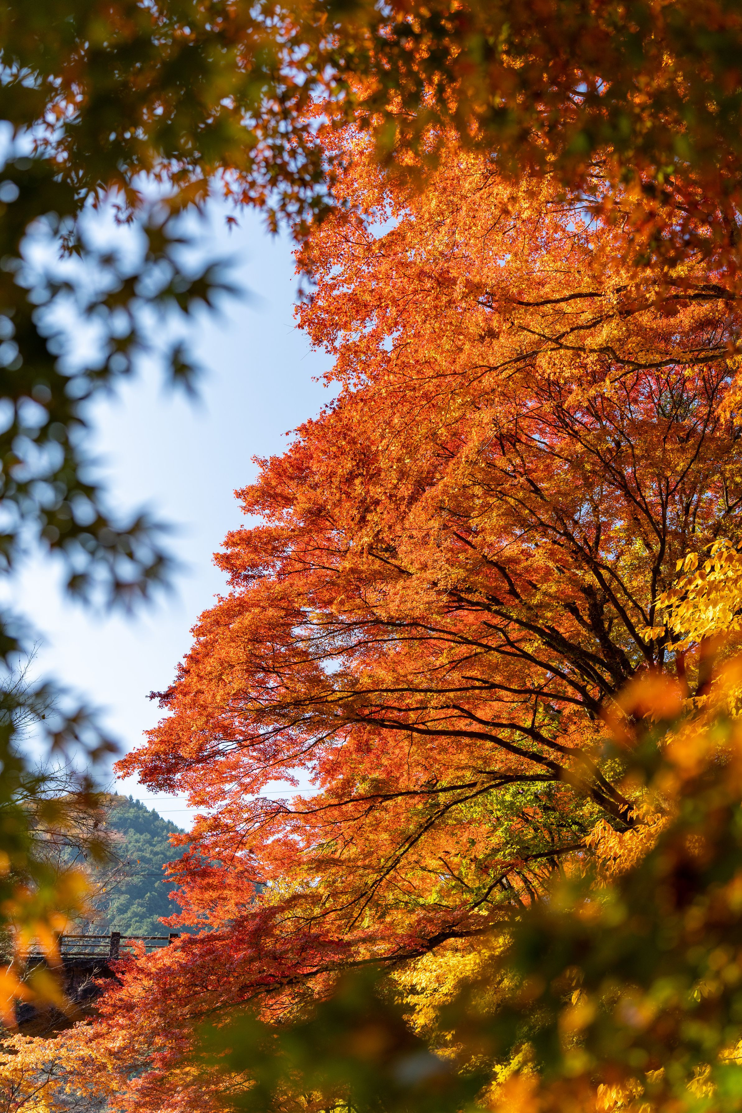美しく色づいた大紅葉を緑が残る葉のフレームから眺める.宙のまにまに青さとのコントラストも美しい.