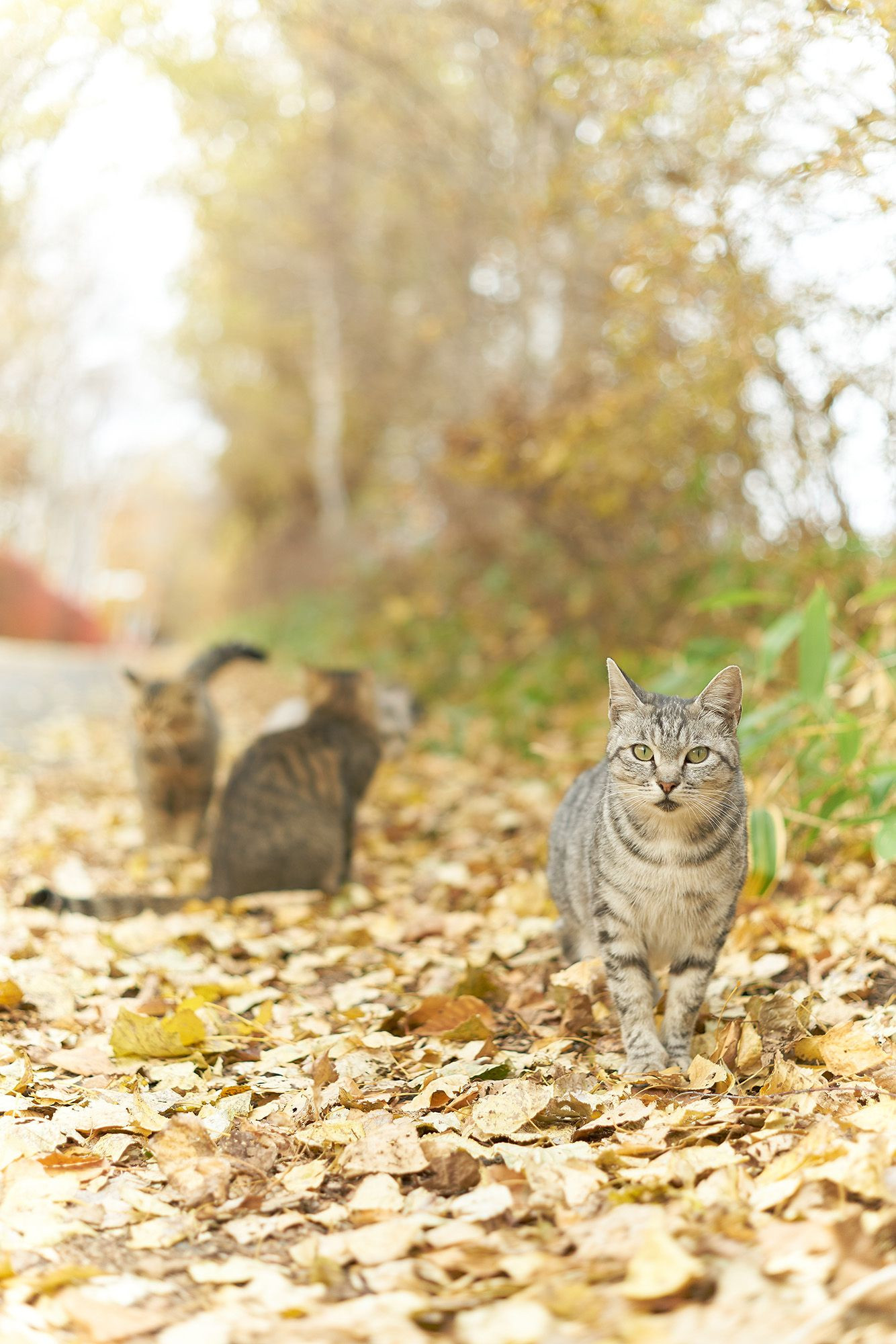 落ち葉が積もる散歩道でネコの集会に遭遇。 込み入った話し合いなのかもしれないので邪魔しないようにそっと観覧。