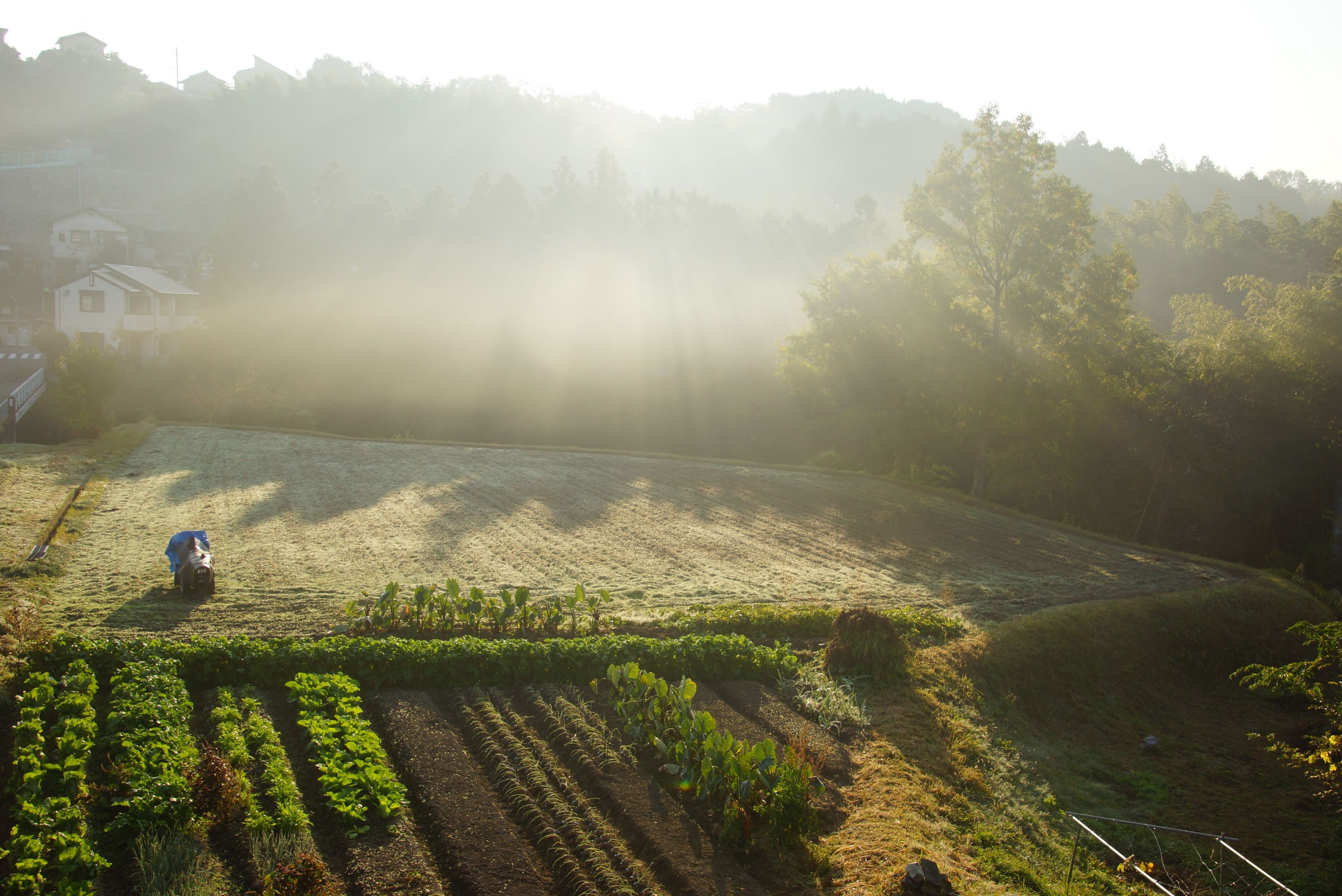刈り取りの終えた土地に雨よけの被った耕運機に朝霧と朝日の光