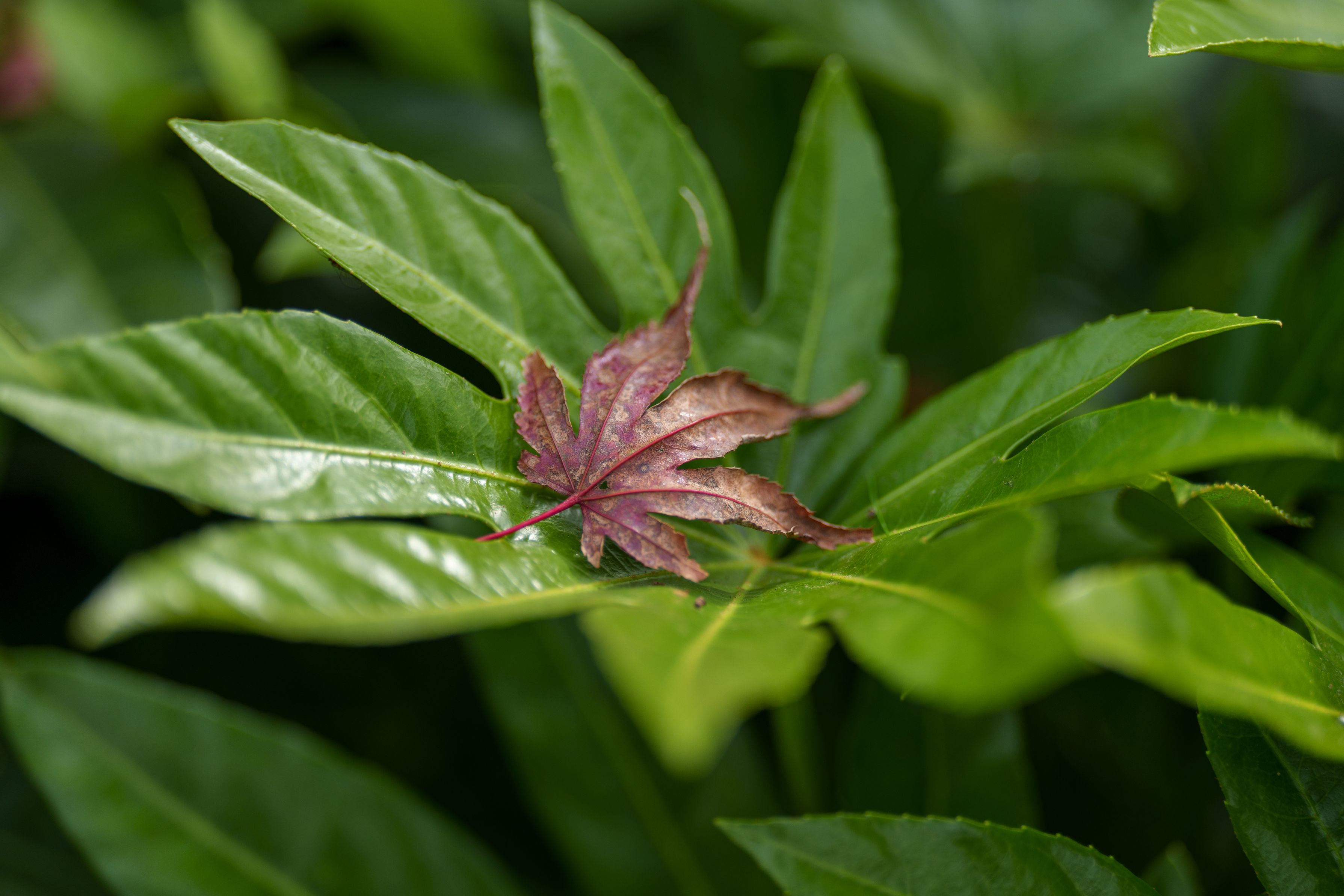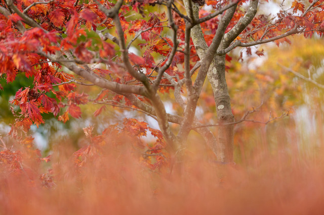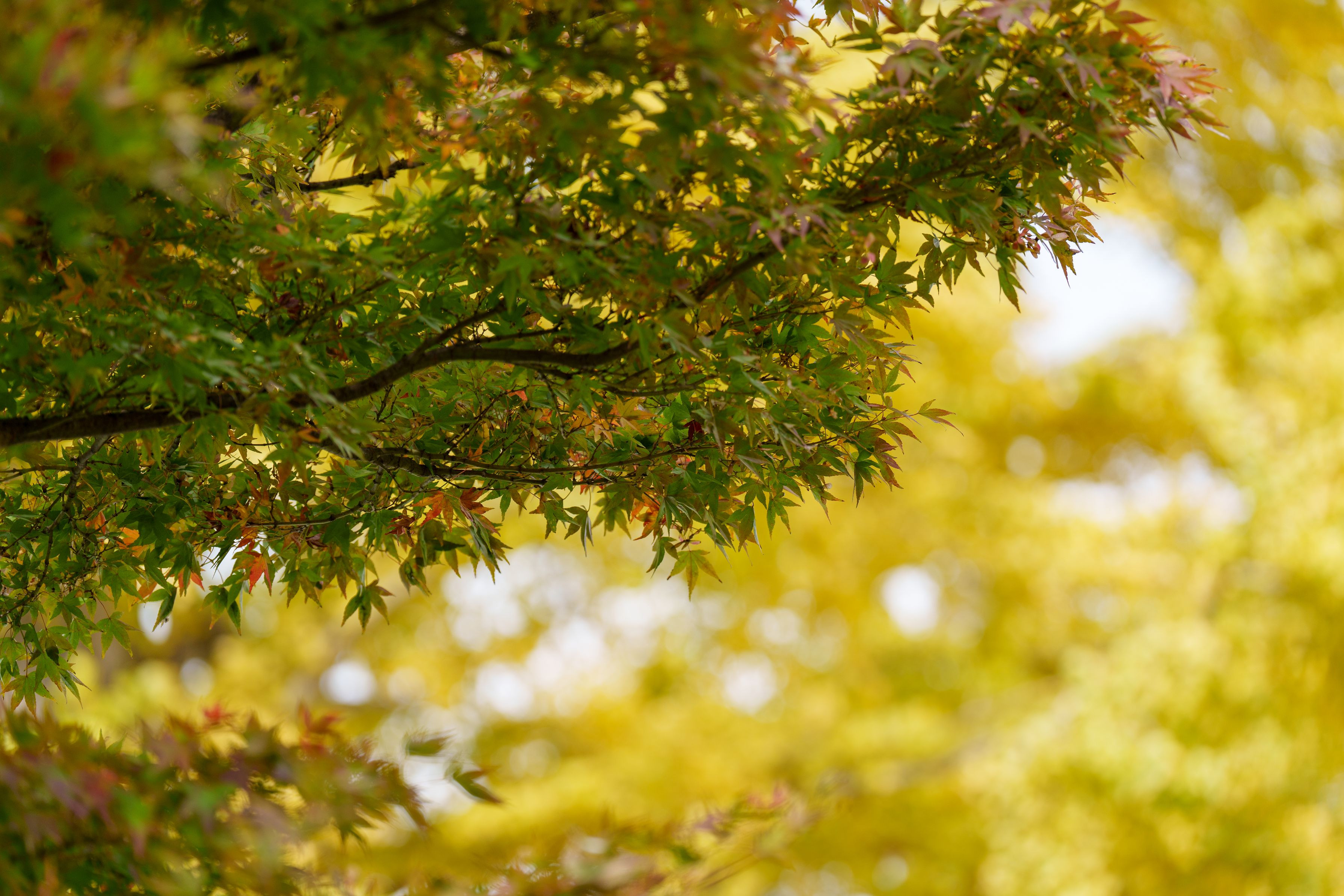 同じ日、同じ場所で3様に色付く楓です