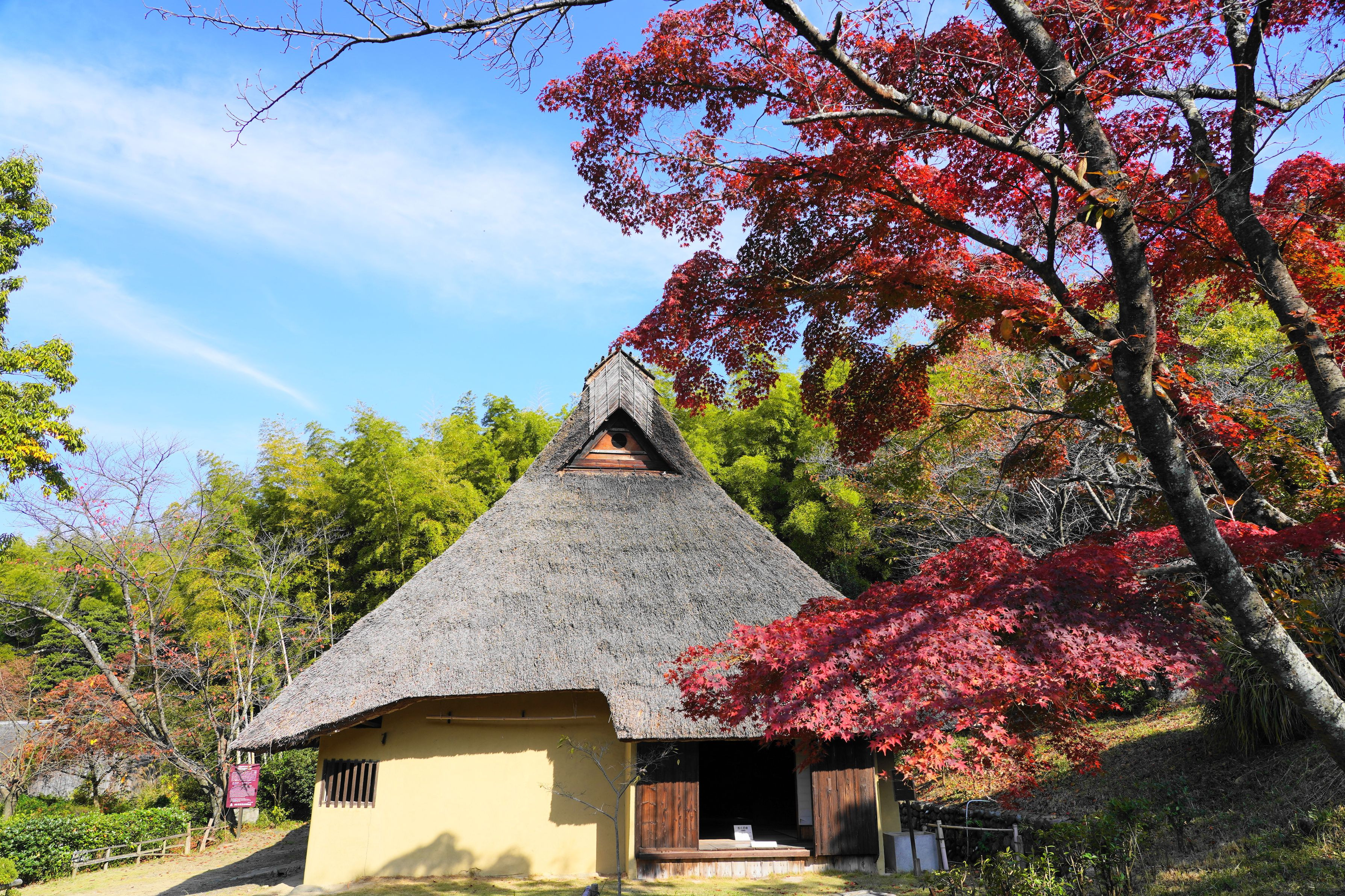 古民家集落の茅葺屋根と紅葉を撮ってみましたが、紅葉の色が今一赤くなりませんねぇ。関西の里の紅葉はこんなもんなんでしょうか?もうちょっと寒くなると、鮮やかになるんでしょうかね。