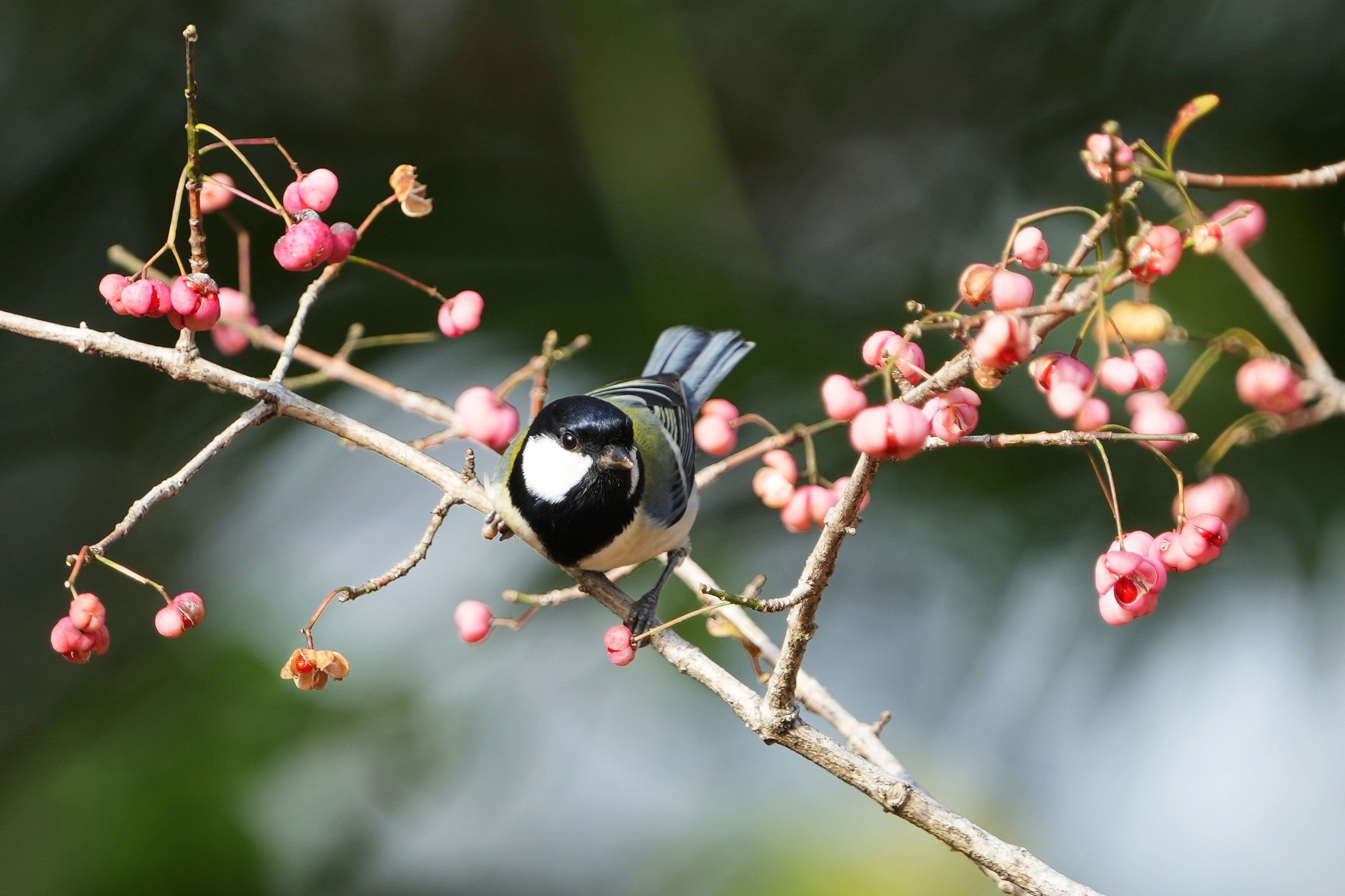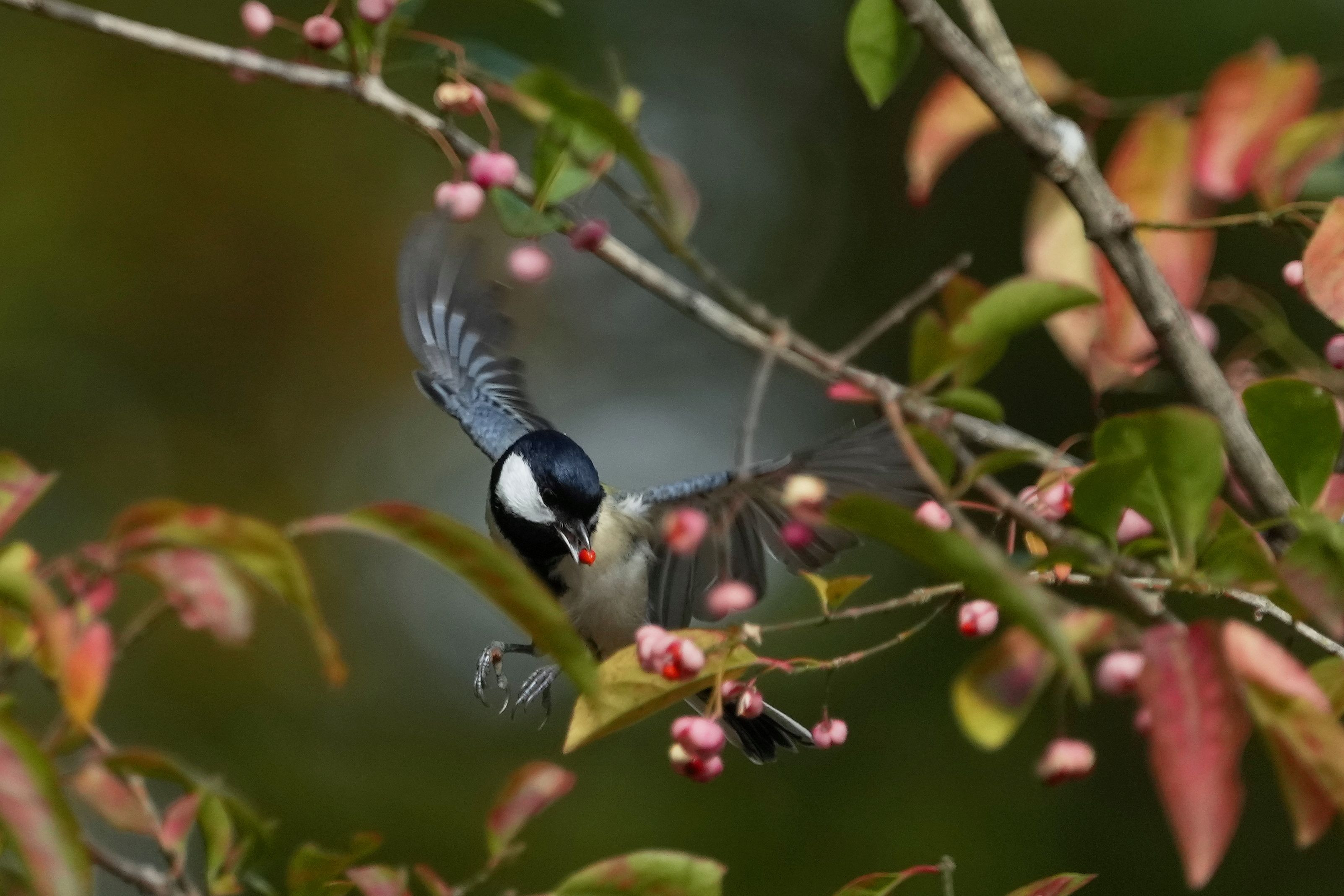 今年も公園のマユミが実をつけました。 一番にやって来たのはシジュウカラさん!ムギマキさんばりのホバリングで咥えていました。 #シジュウカラ#
