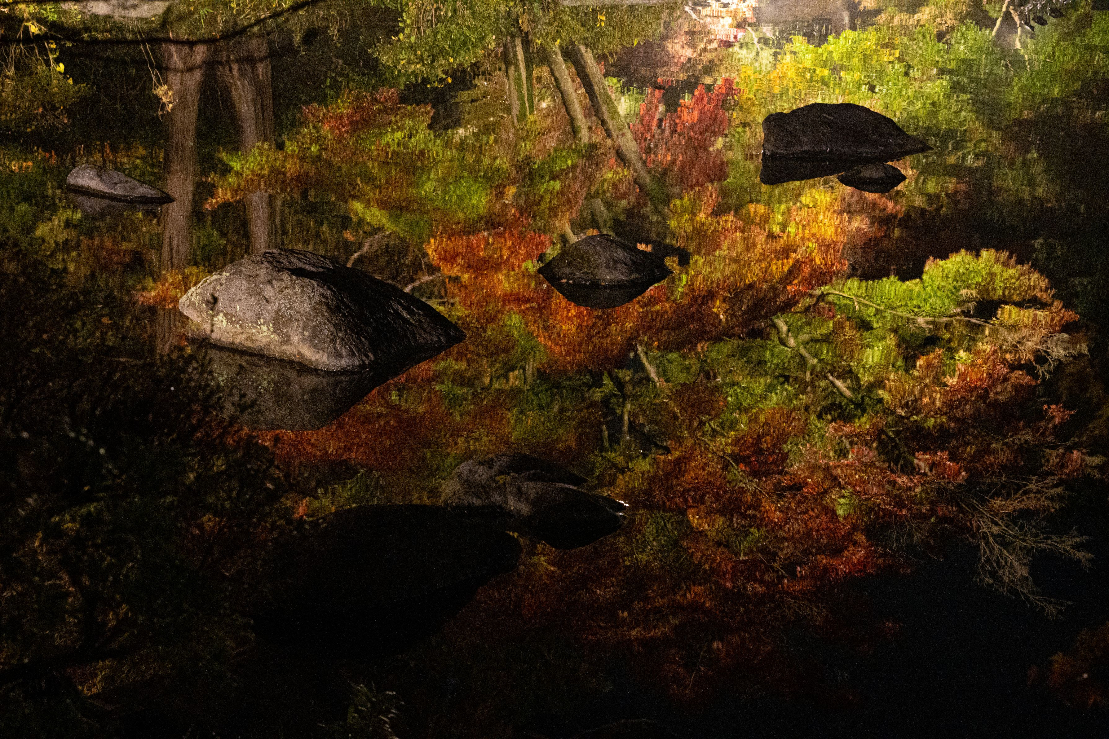 飛び石と水面に映った紅葉を切り取ってみました。
