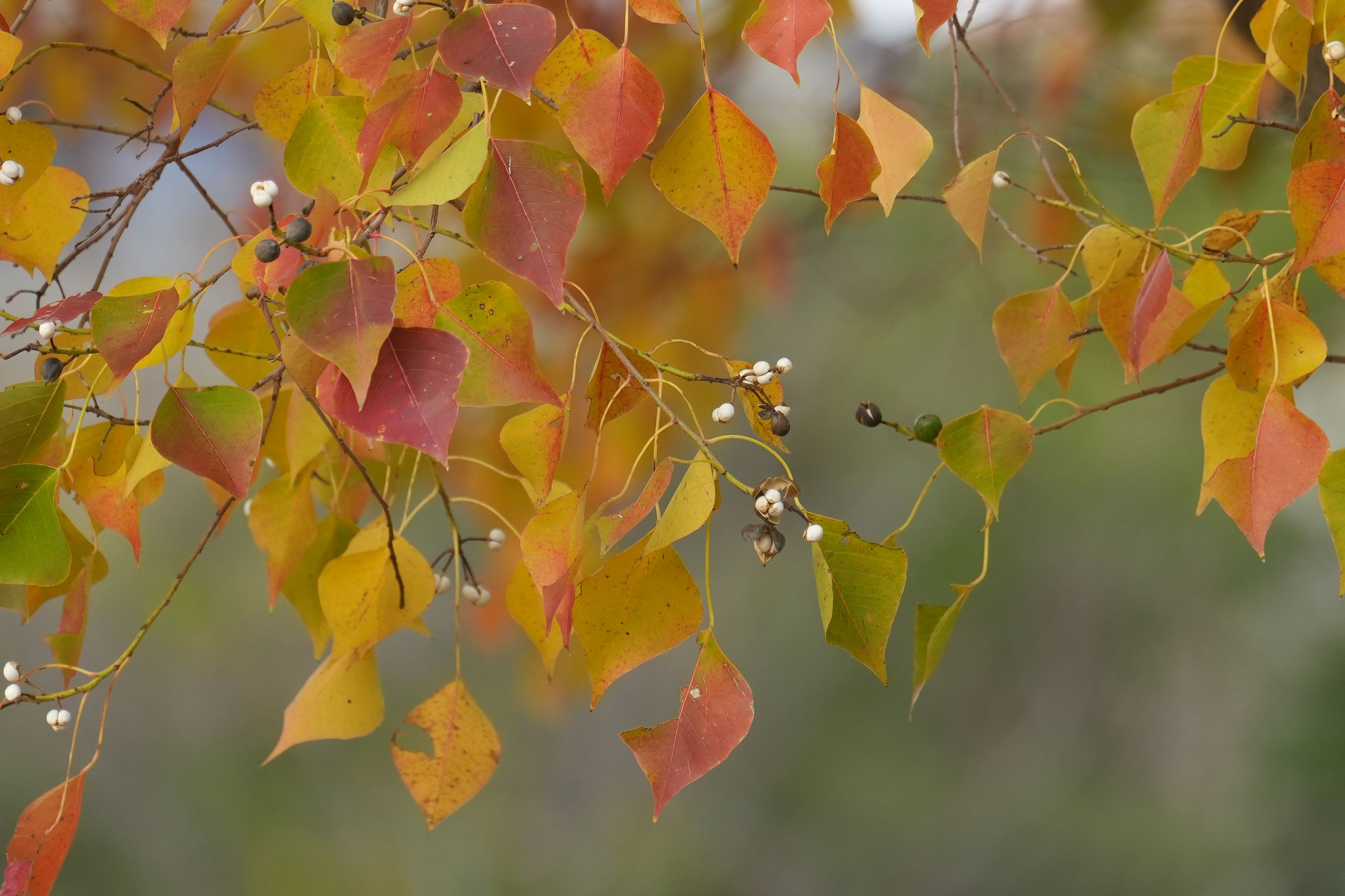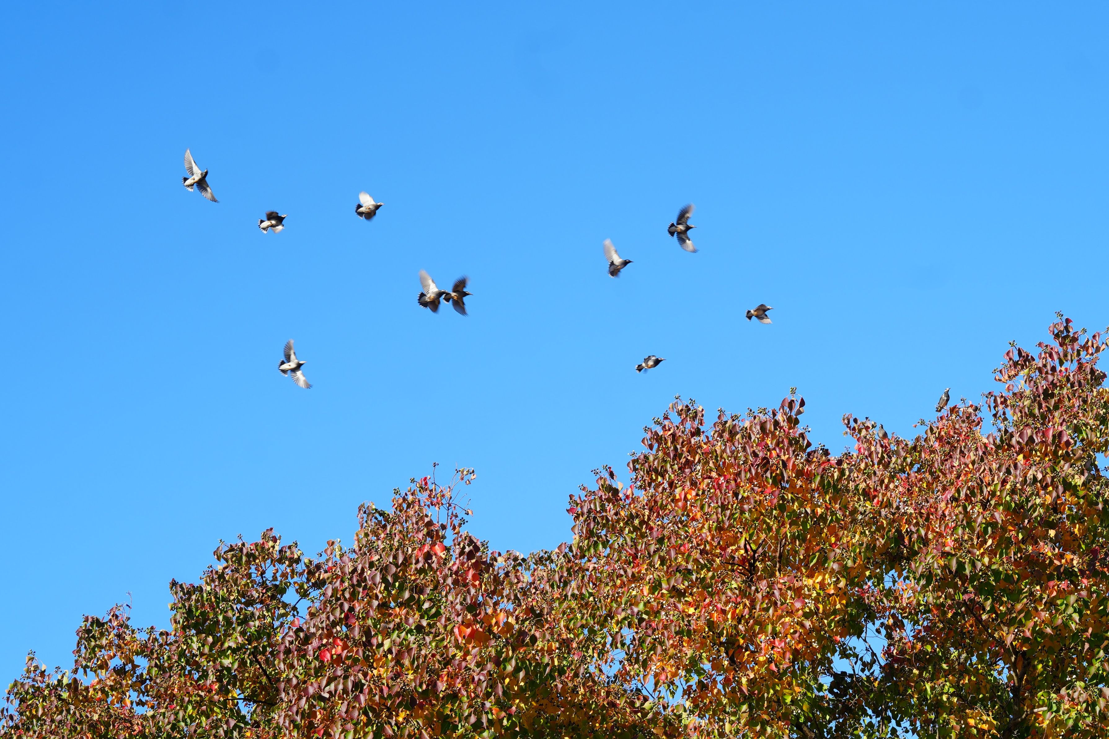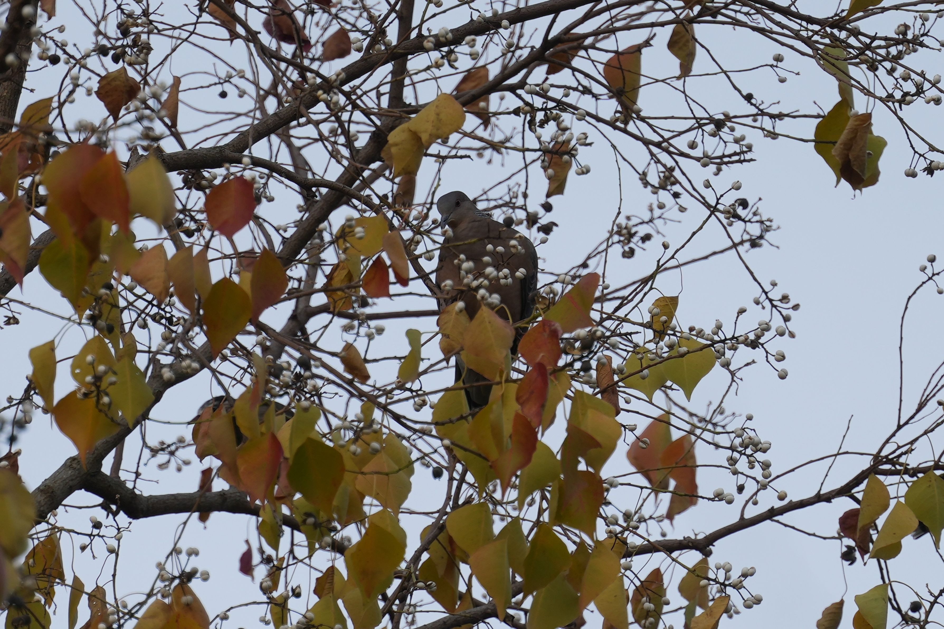 ナンキンハゼの紅葉が見事です。 一方、鳥たちは葉の色づきには目もくれず熟した実を食べに毎朝やって来ます。