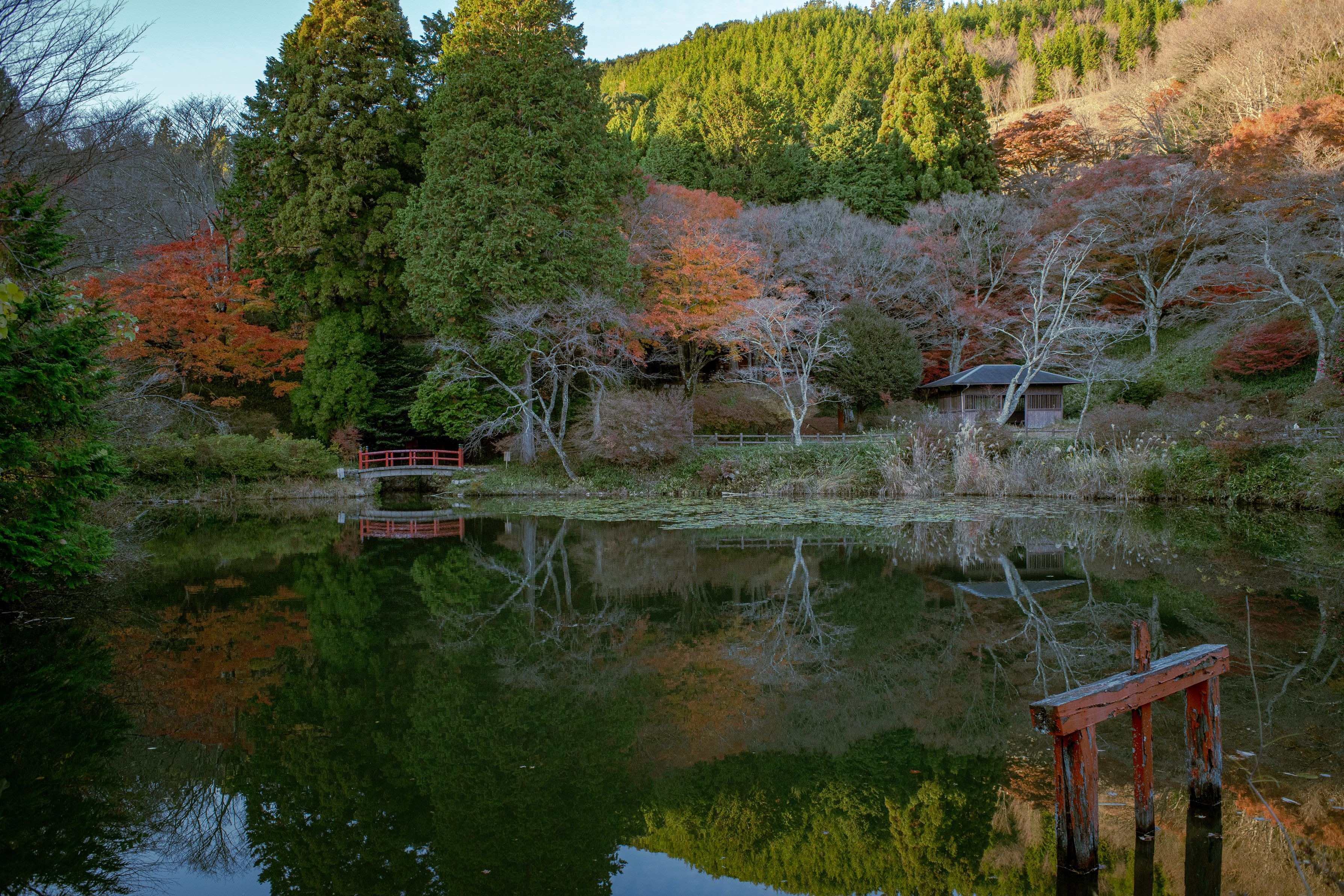鳥見山公園にある池で撮影しました。 水面がまるで鏡面のように綺麗に景色を反射させていました。 使用レンズ:MINOLTA MC W.ROKKOR-SI 28mm F2.5