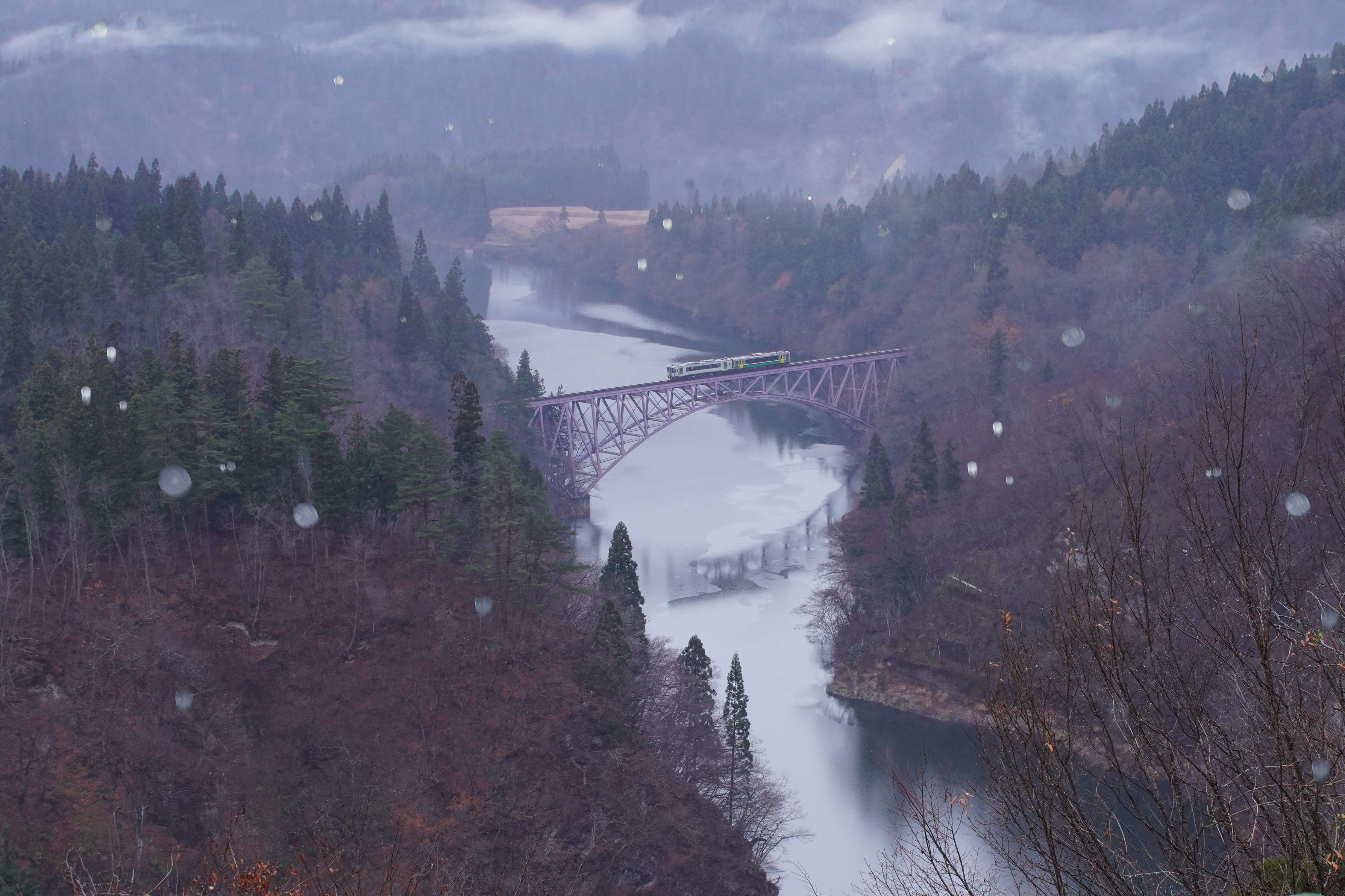 紅葉も終わりもうすぐ冬を迎える只見川第一橋梁の姿を、雨粒を加えて撮りました。