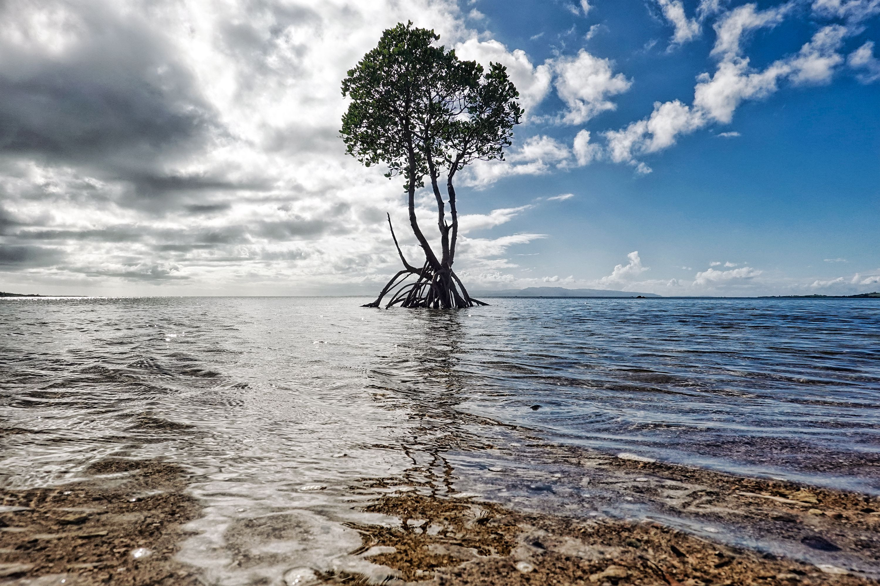 「一本マングローブ」 マングローブとはヒルギ科の木の総称。 石垣島名蔵湾の1本ヒルギは存在感が半端なかった。 午前中は干潮でむき出しだったけど、やはり潮が満ちてからの方がかっこいいので、午後に再訪し撮影。 沖縄県石垣市 石垣島名蔵湾