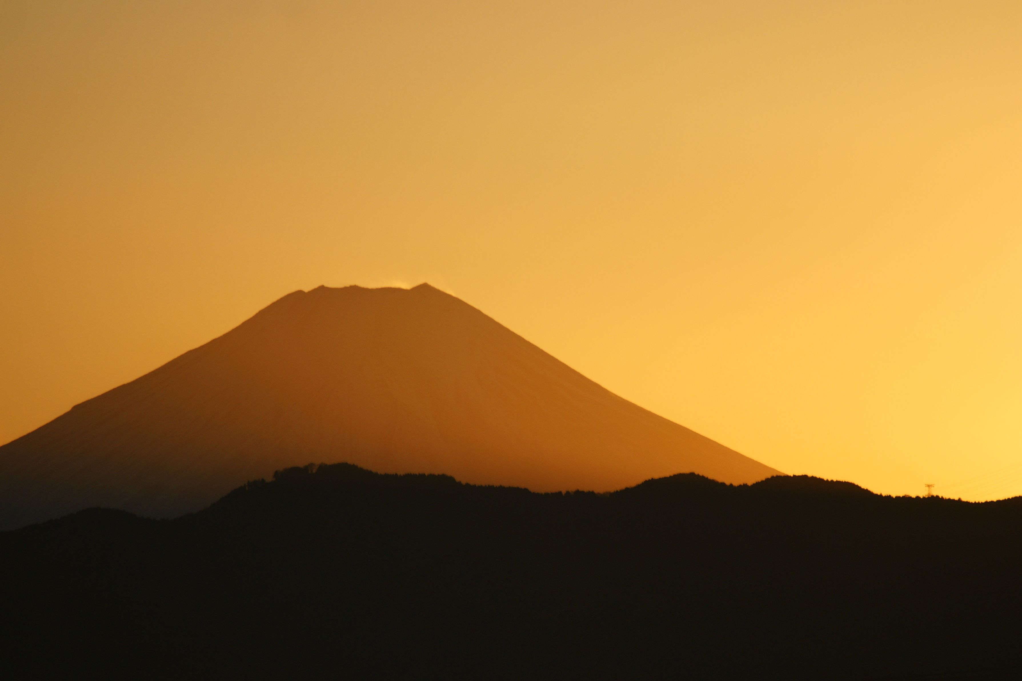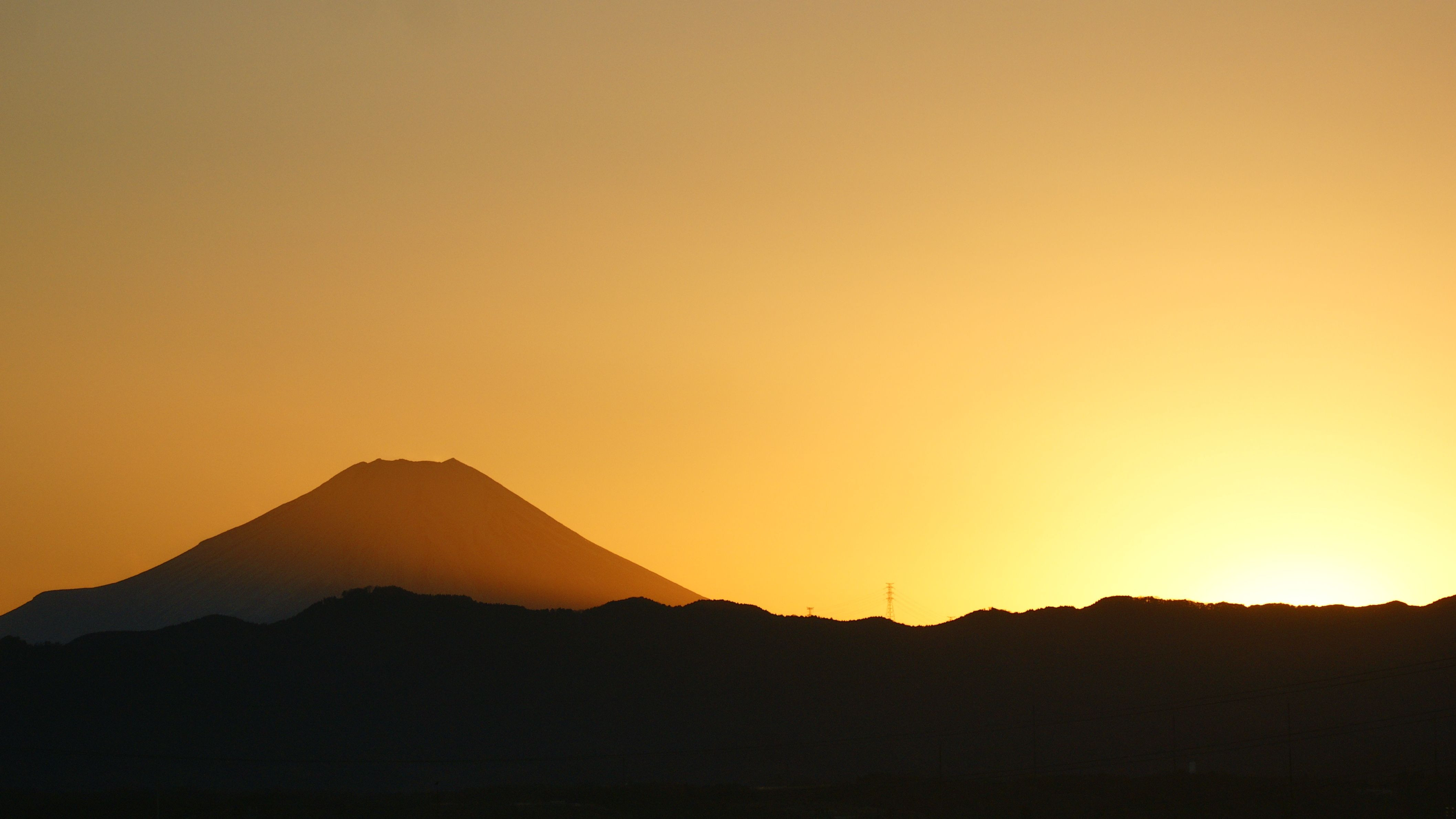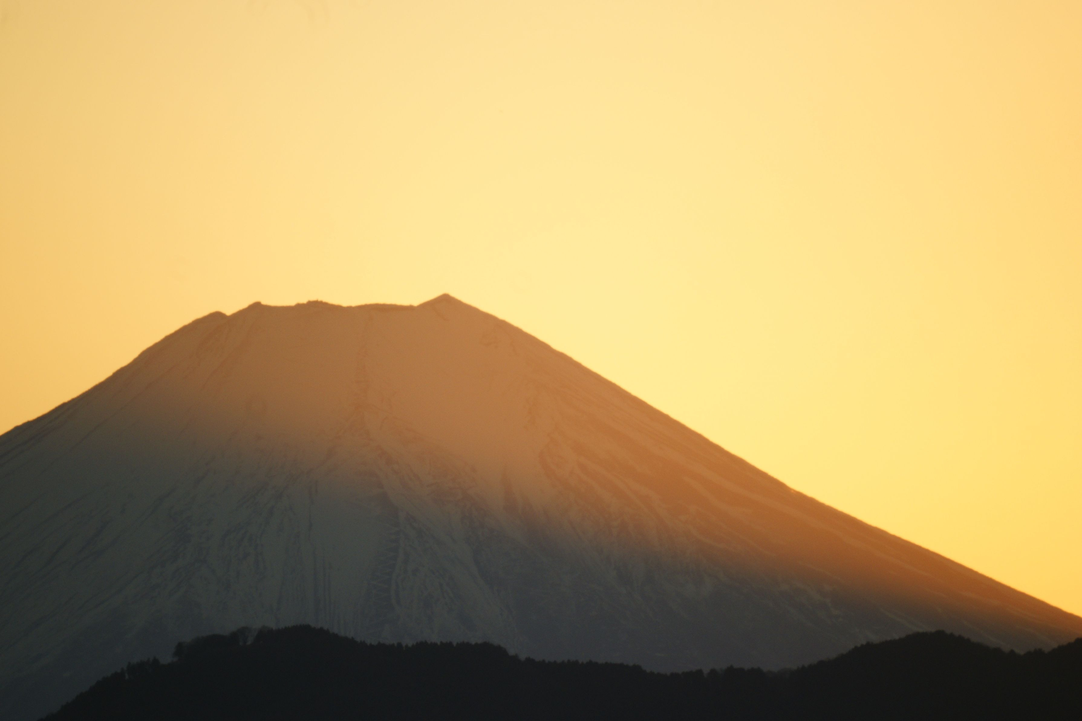 赤く染まった富士山、ジグザグの登山道。茜の下は凍てつく氷でしょうか?