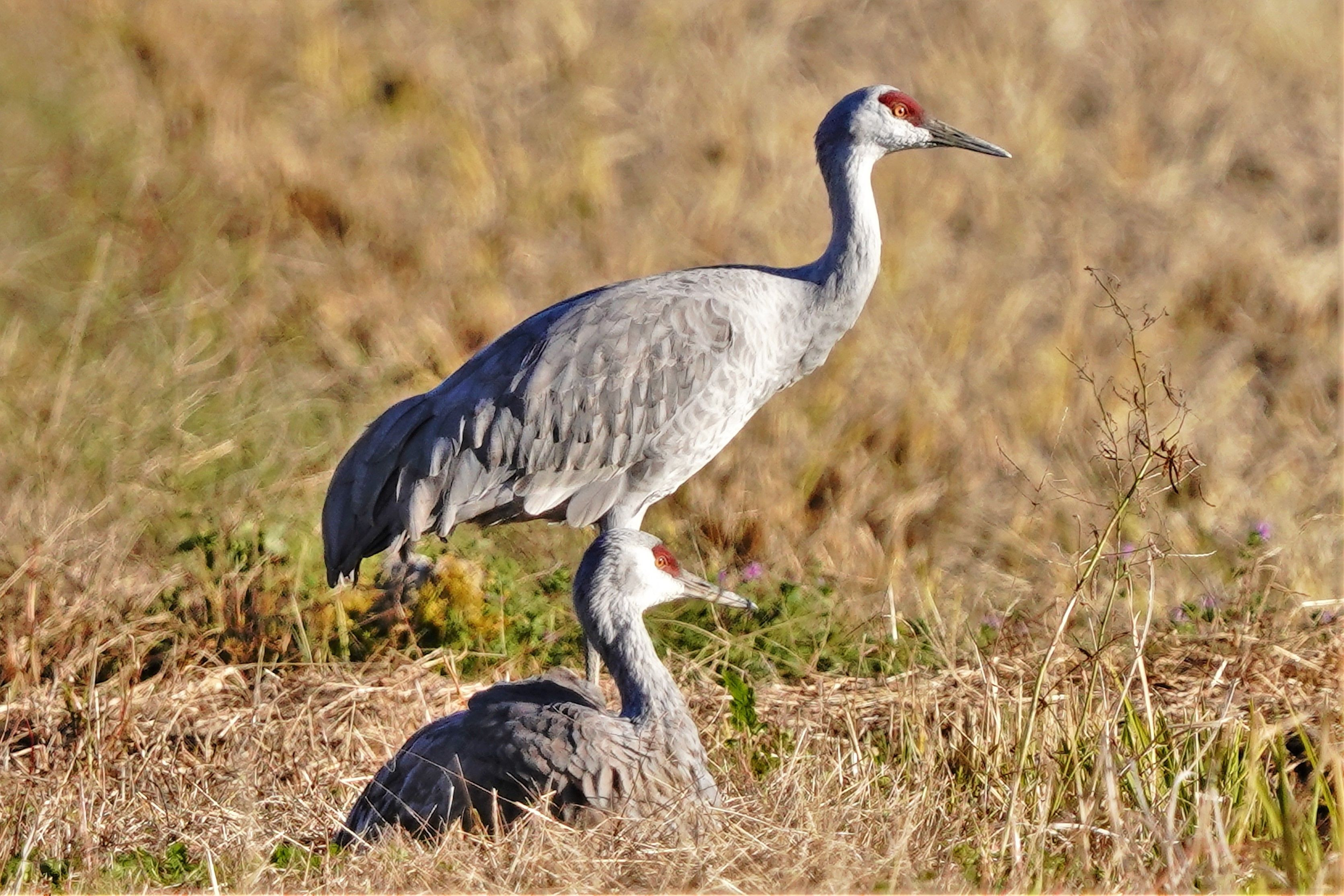 迷鳥カナダヅルのペアーが渡来しました。夕日に思いをはせるかのように仲良くくつろいでいました。