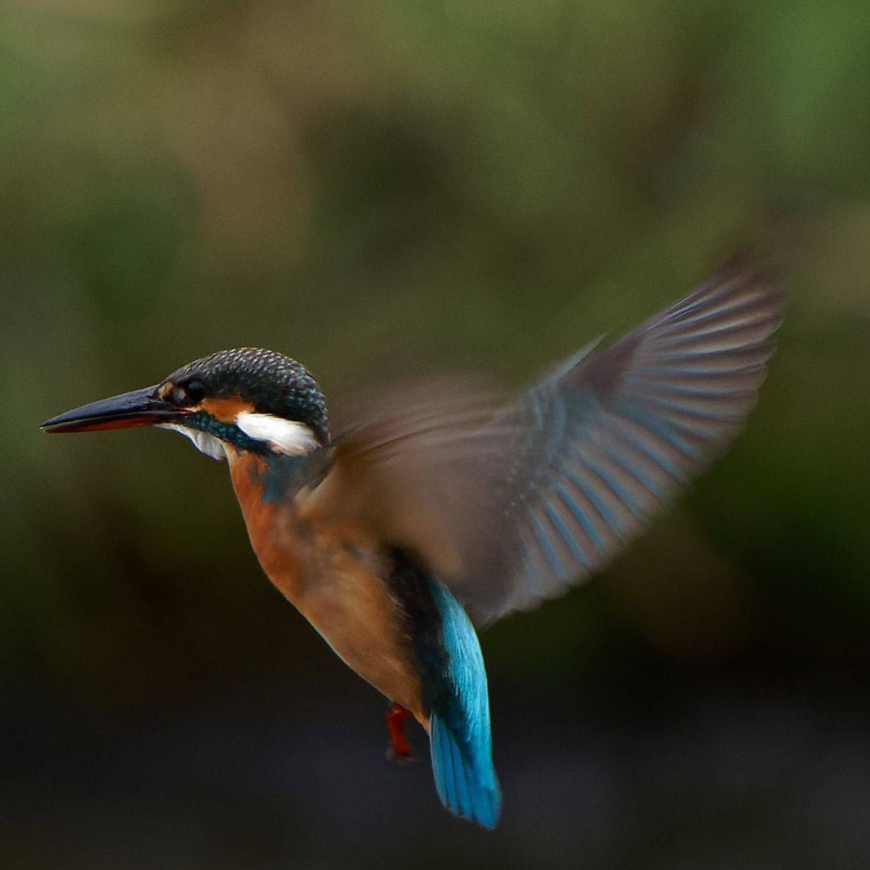 カワセミがホバリングして、川の中の魚を探しているところです。