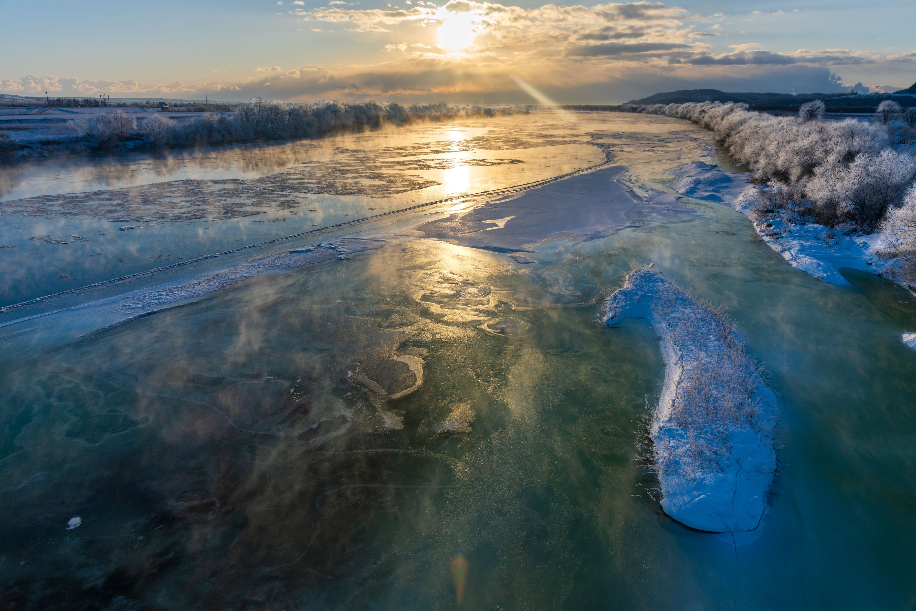 ハルニレの木の日の出を撮った後の帰り道。 十勝川にかかる橋から見た光景があまりにも美しくて 堤防に車を停めて、橋の上を走りました^^ ※こんなに綺麗な光景なのに、撮っていたのは私一人でした;;