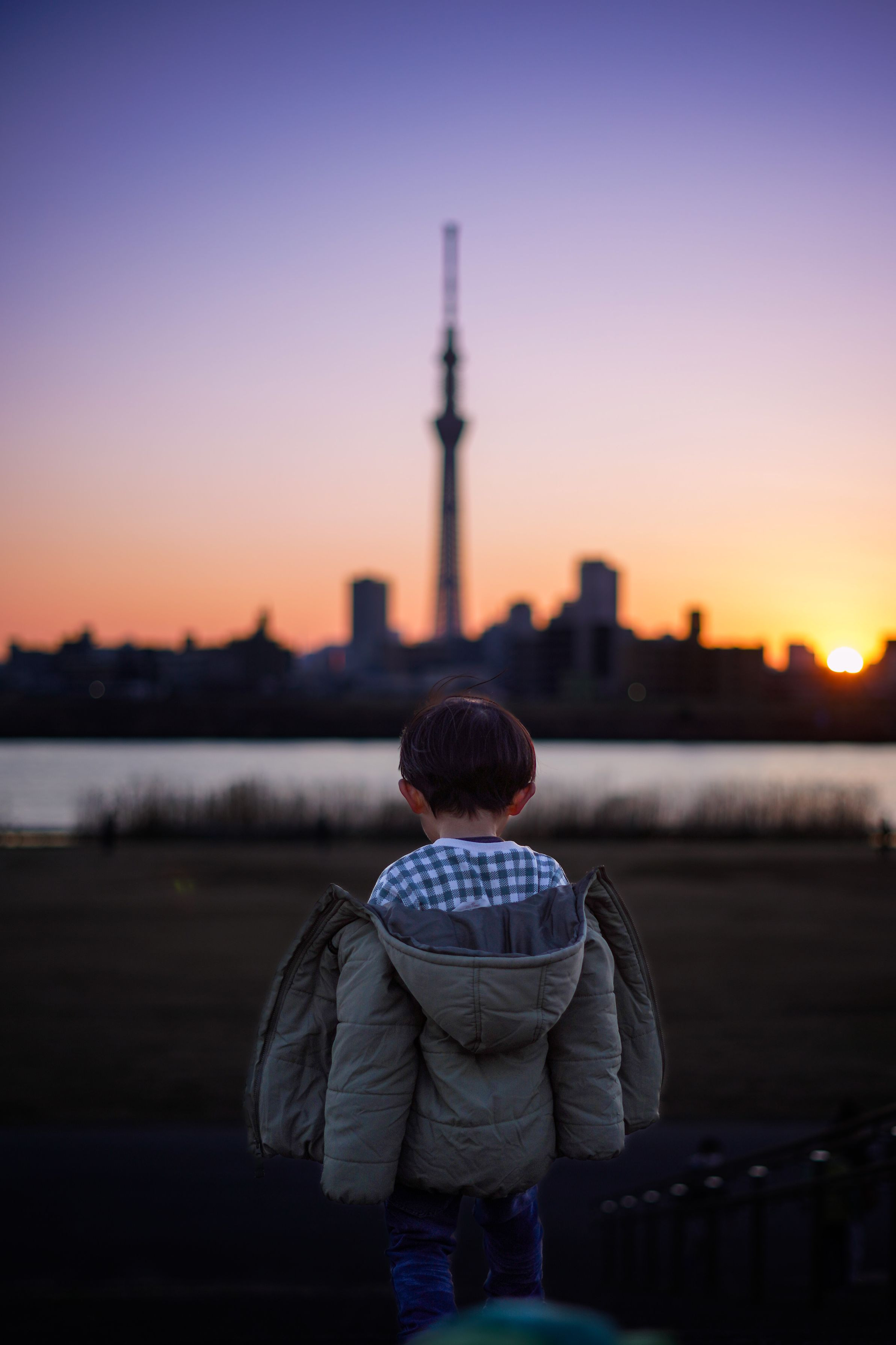2023最初の写活は 子供と近所の土手から眺める初夕陽 ̖́- マジックアワーがとっても綺麗でした♬.*゚