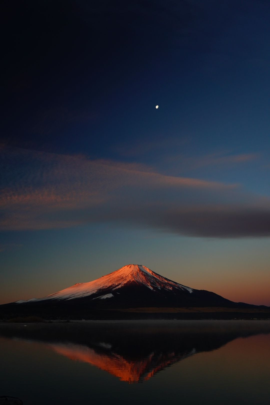 風がなく水面にも紅富士が映る。 いい景色に出会えました。
