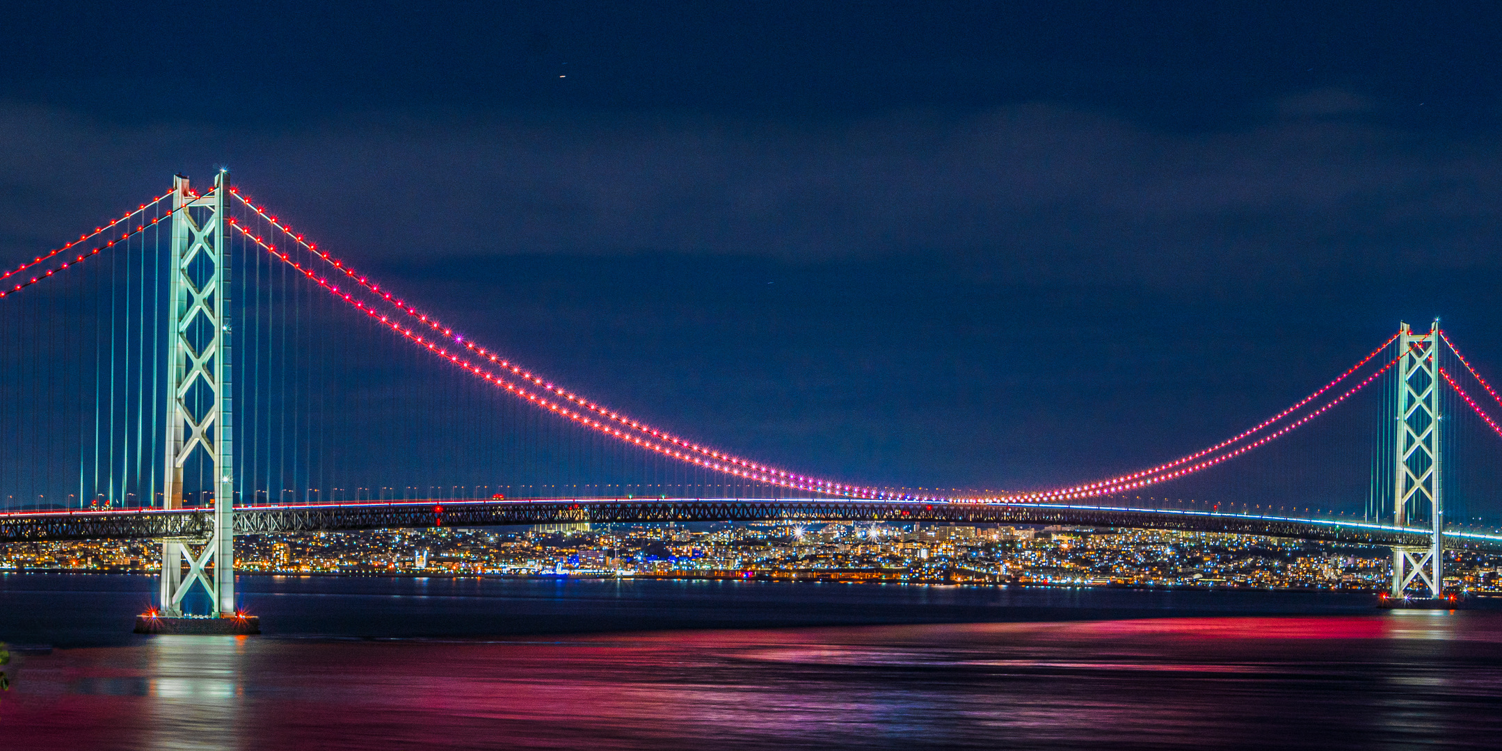 明石海峡大橋と明石市街地の夜景です。次はレインボー色のライトアップの時に行ってみたいです。