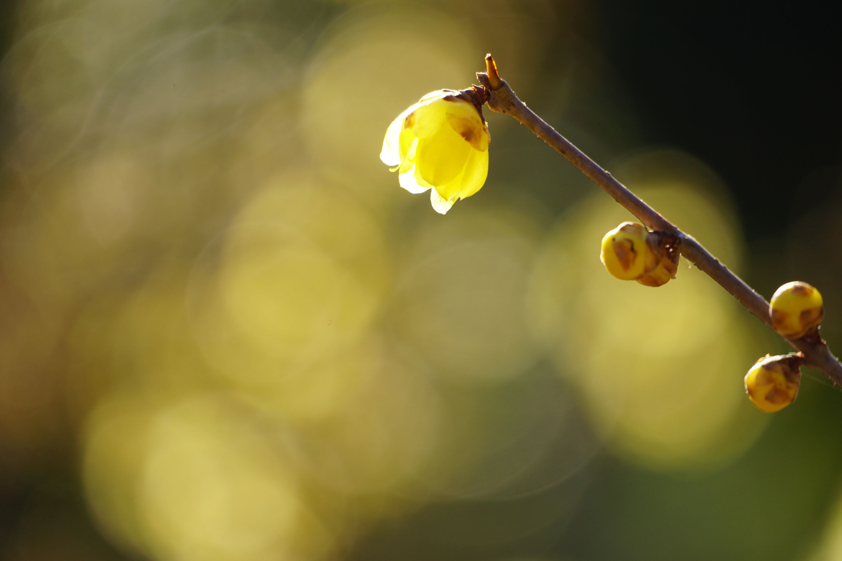 埼玉県所沢市 航空記念公園ロウバイ園にて 小さめで芯まで黄色いので、ソシンロウバイだと思われます まだ咲き始めですが、ロウバイはアップの方が映えるので 全然かまいません