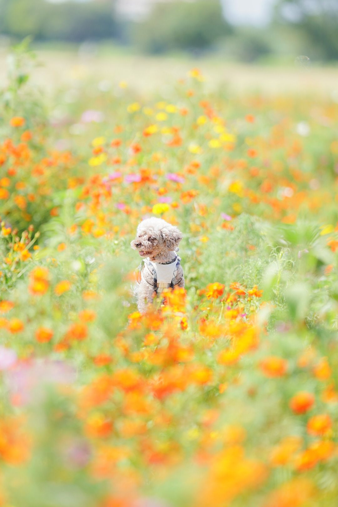 広場の花壇に毎年咲く背の高いオレンジ色のキバナコスモスやピンクのコスモスと朝日で眩しいお顔の愛犬を撮影しました