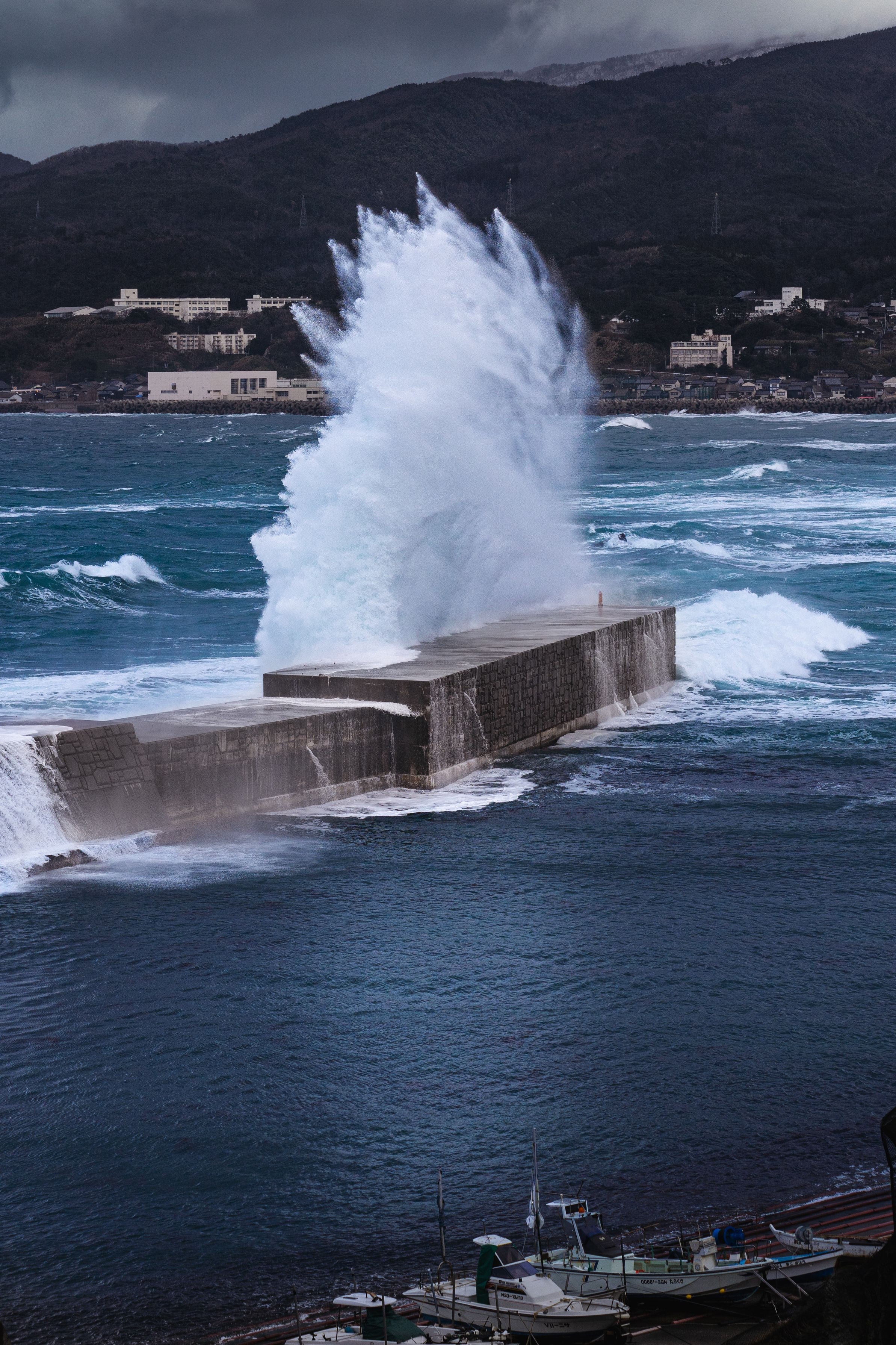 寒波により佐渡汽船フェリーが欠航した翌日、時化のピークは夜のうちに過ぎてしまっていました。奥は相川の町です。