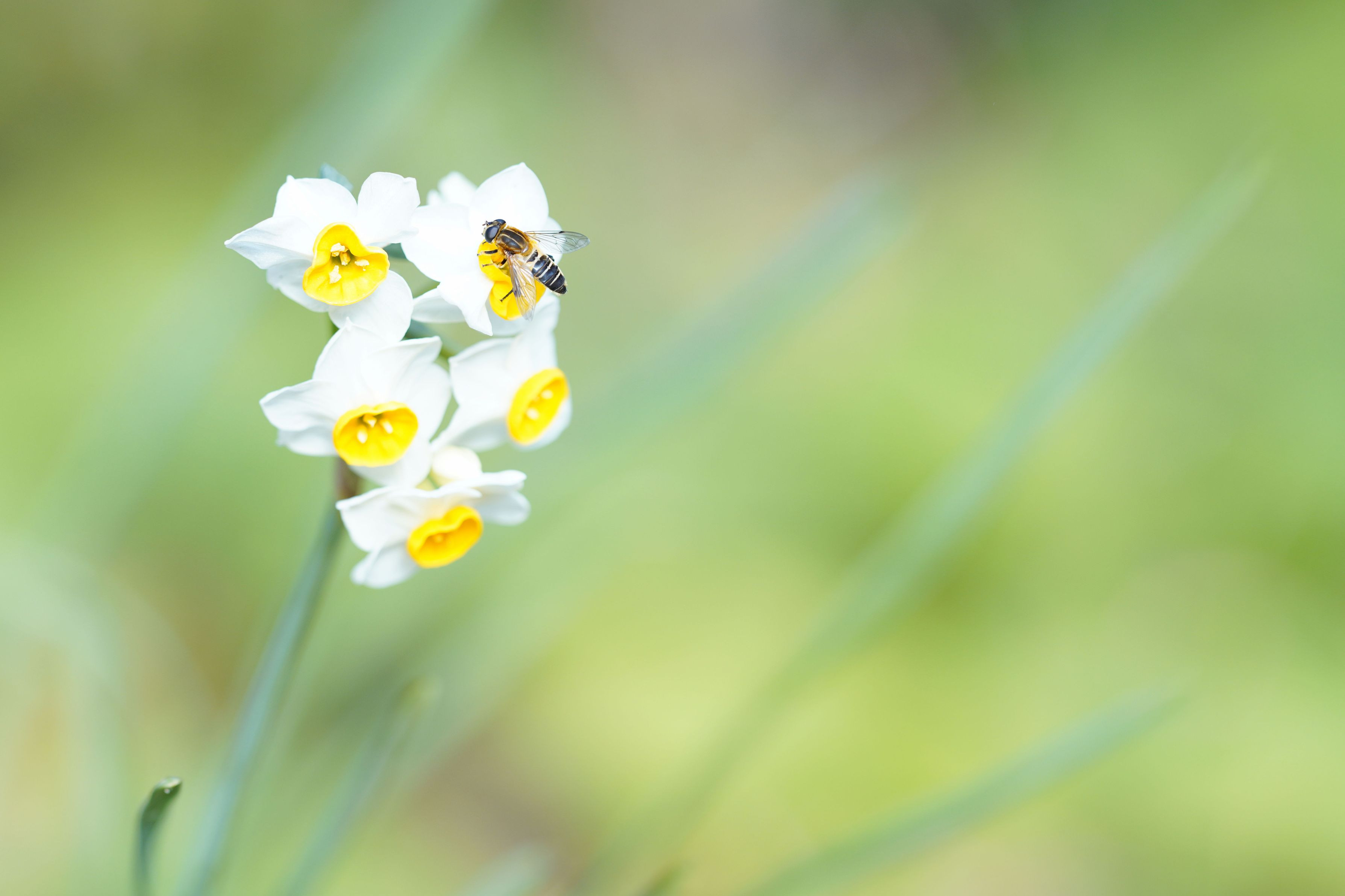 お寺のお庭に咲く水仙に誘われて蜂が・・・ 寒波が来るのに大丈夫なのでしょうか