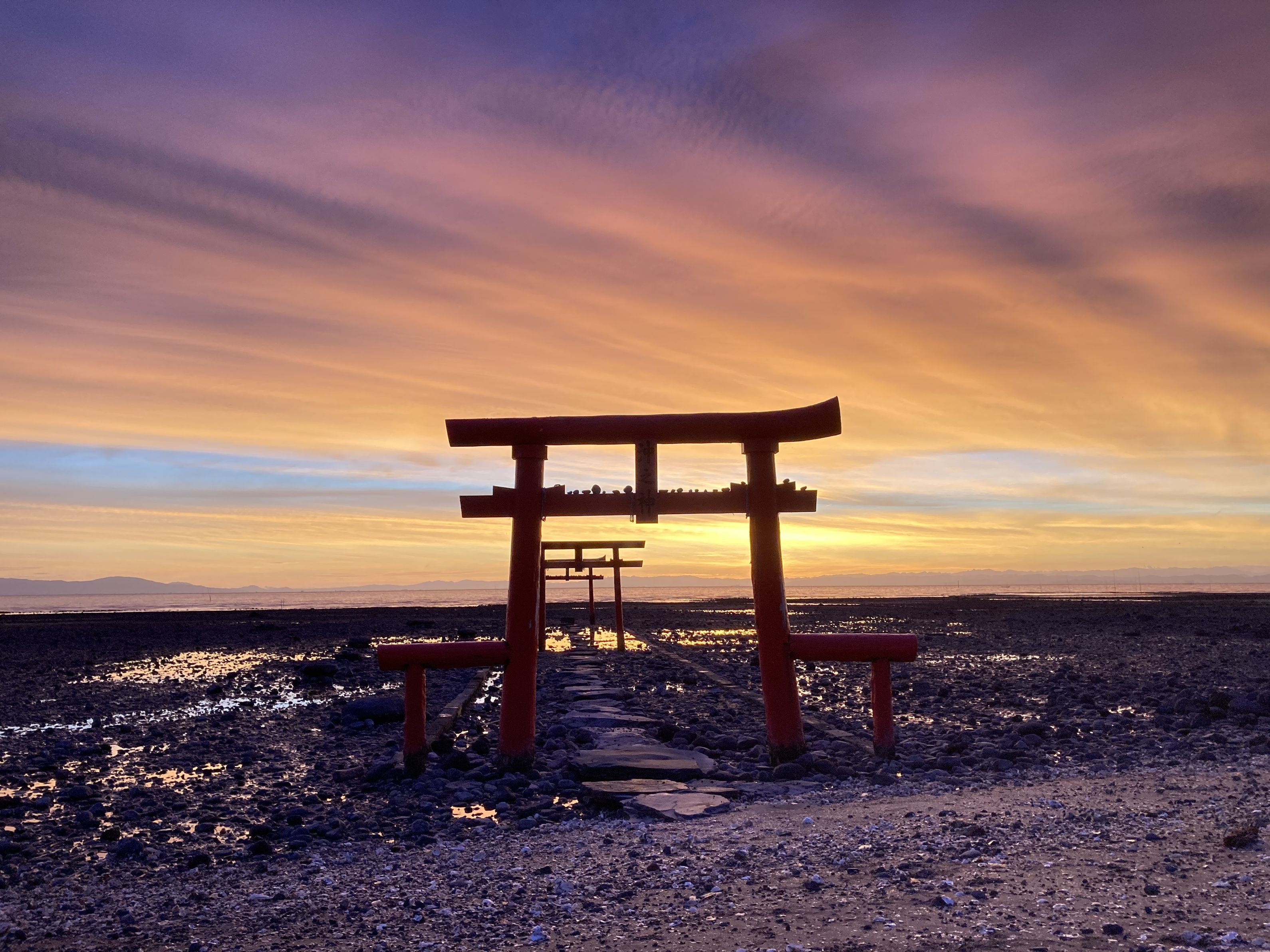 佐賀県の大魚神社の海中鳥居を朝焼け時に撮影しました。 朝特有の空気感と色合いがとても良く撮れました。 雲の表情が良く、タイミングが良かったと思いました。