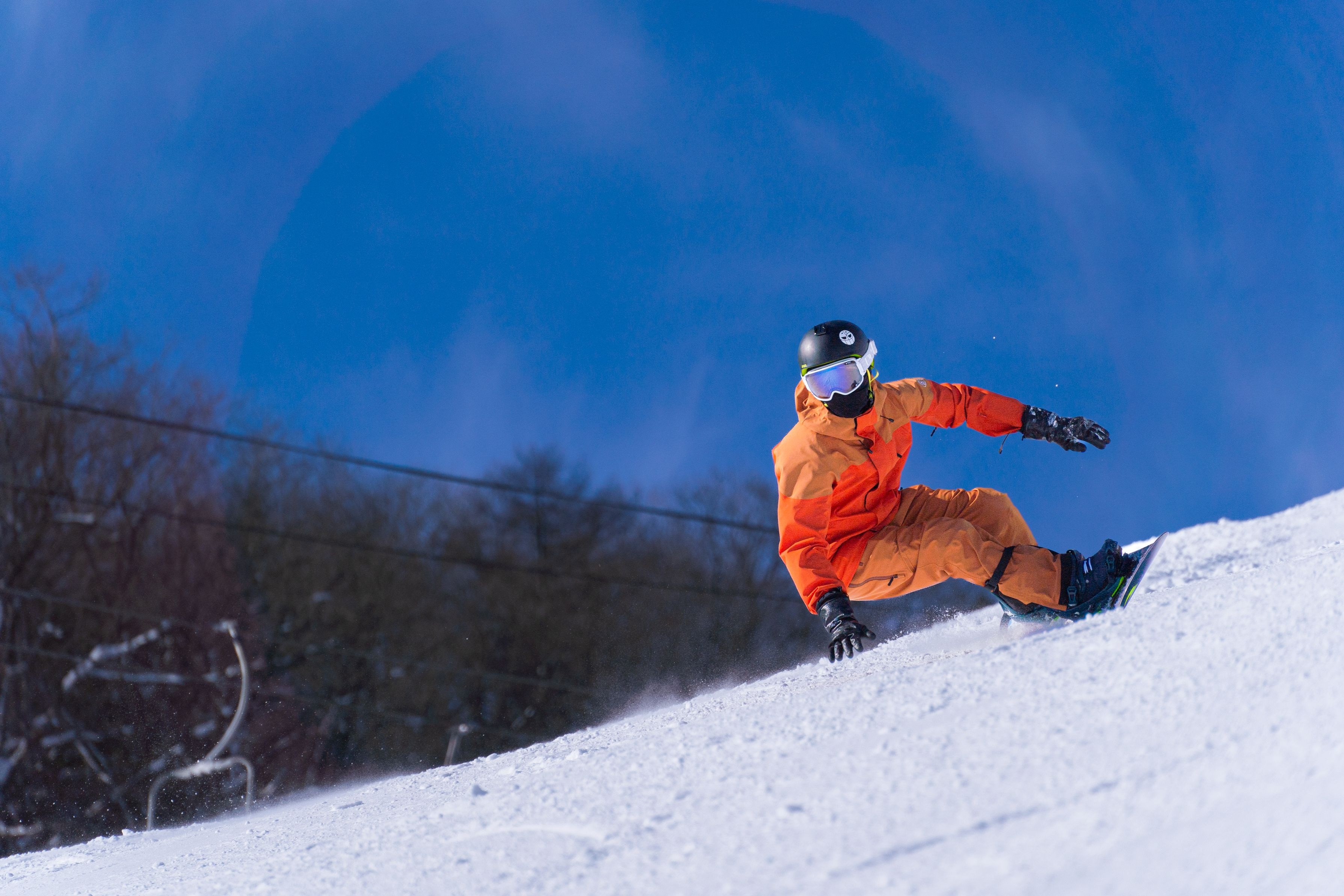 長野県白馬村の白馬岩岳スノーフィールドでカービングターンを特訓中の仲間です。バランスが極まった美しい谷回り。