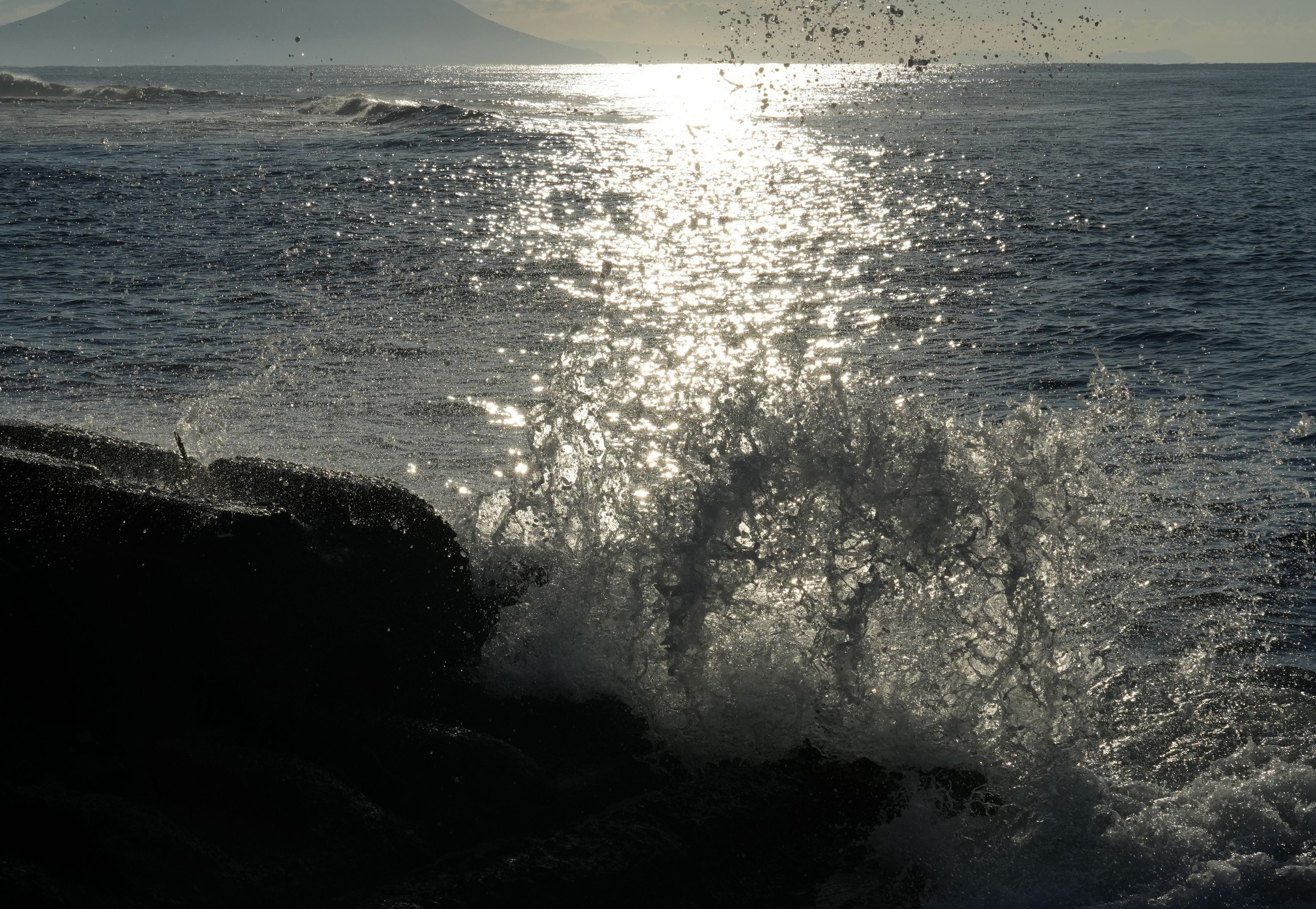 朝日の光の筋と波しぶき